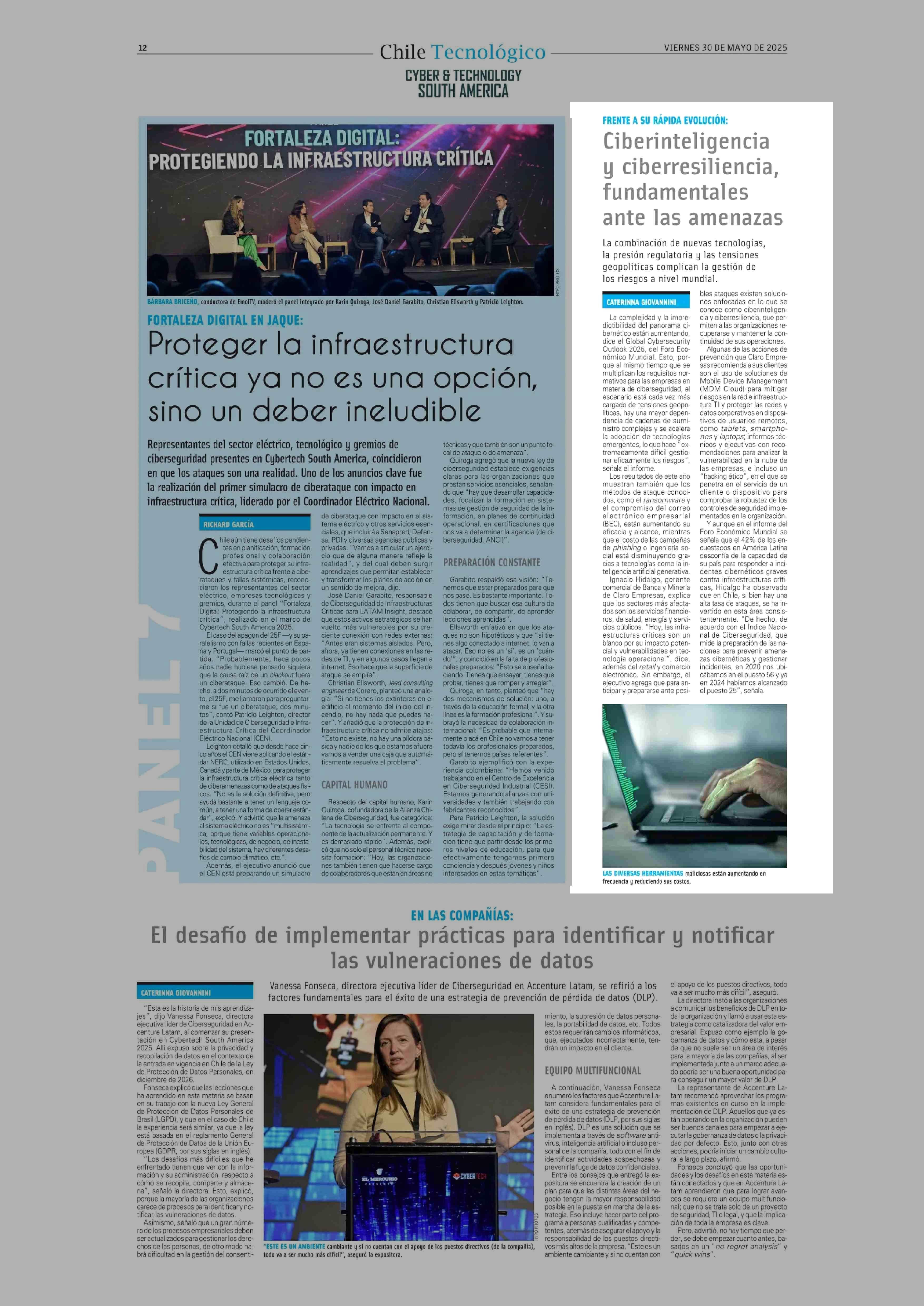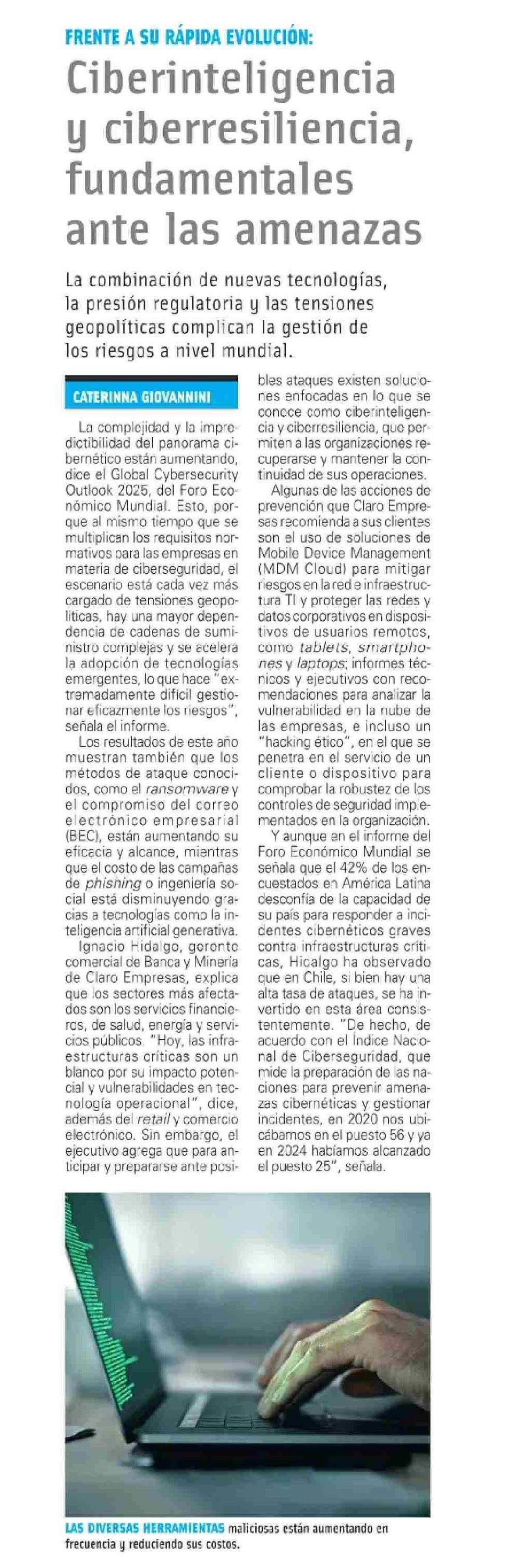 Ciberinteligencia y ciberresiliencia, fundamentales ante las amenazas 30-05-2025 El Mercurio |