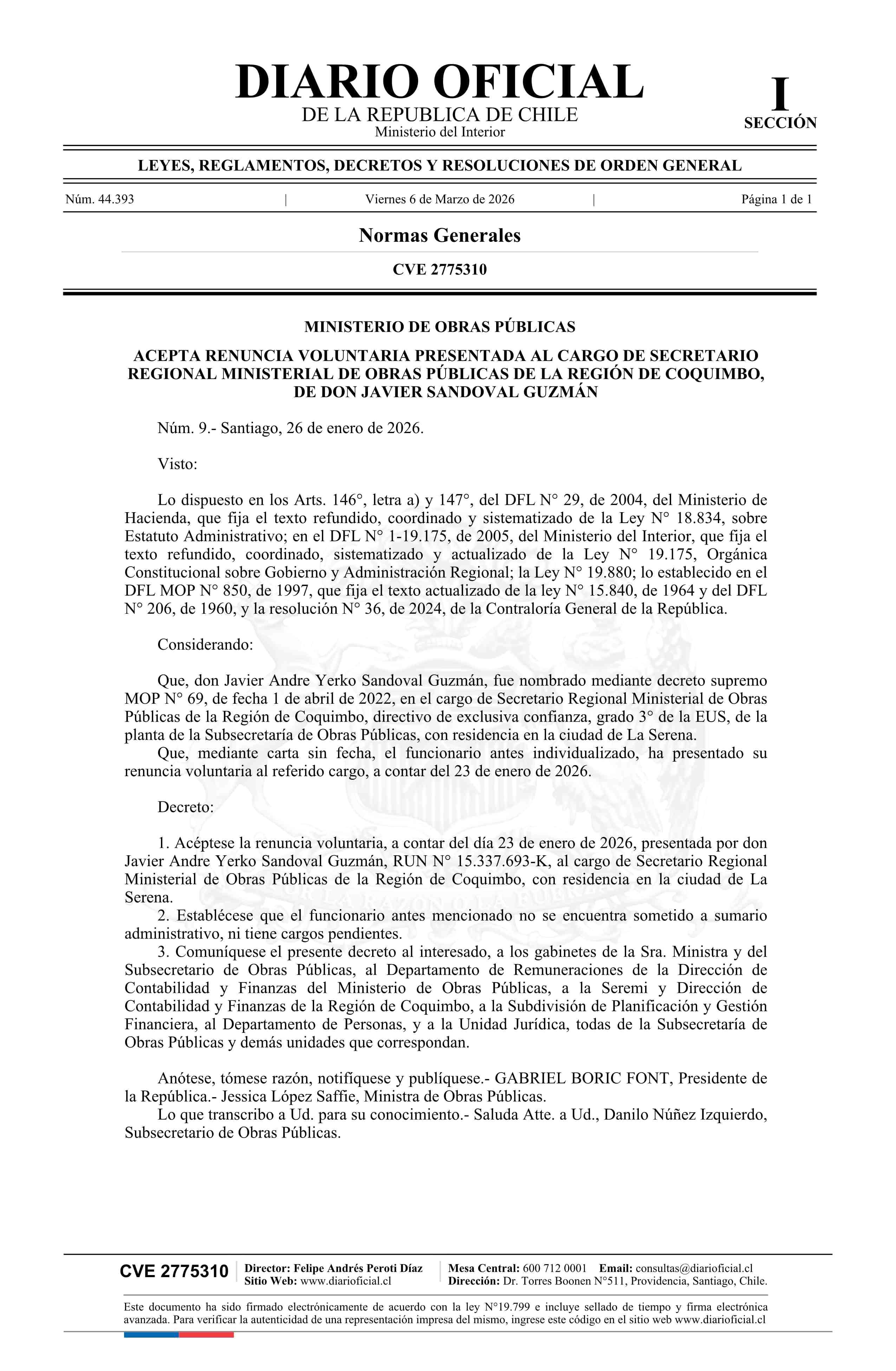 Decreto número 9, de 2026.- Acepta renuncia voluntaria de don Javier Sandoval Guzmán al cargo de Secretario Regional Ministerial de Obras Públicas de la Región de Coquimbo 06-03-2026 DIARIO OFICIAL CHILE - BOLETÍN OFICIAL DE MINERÍA |
