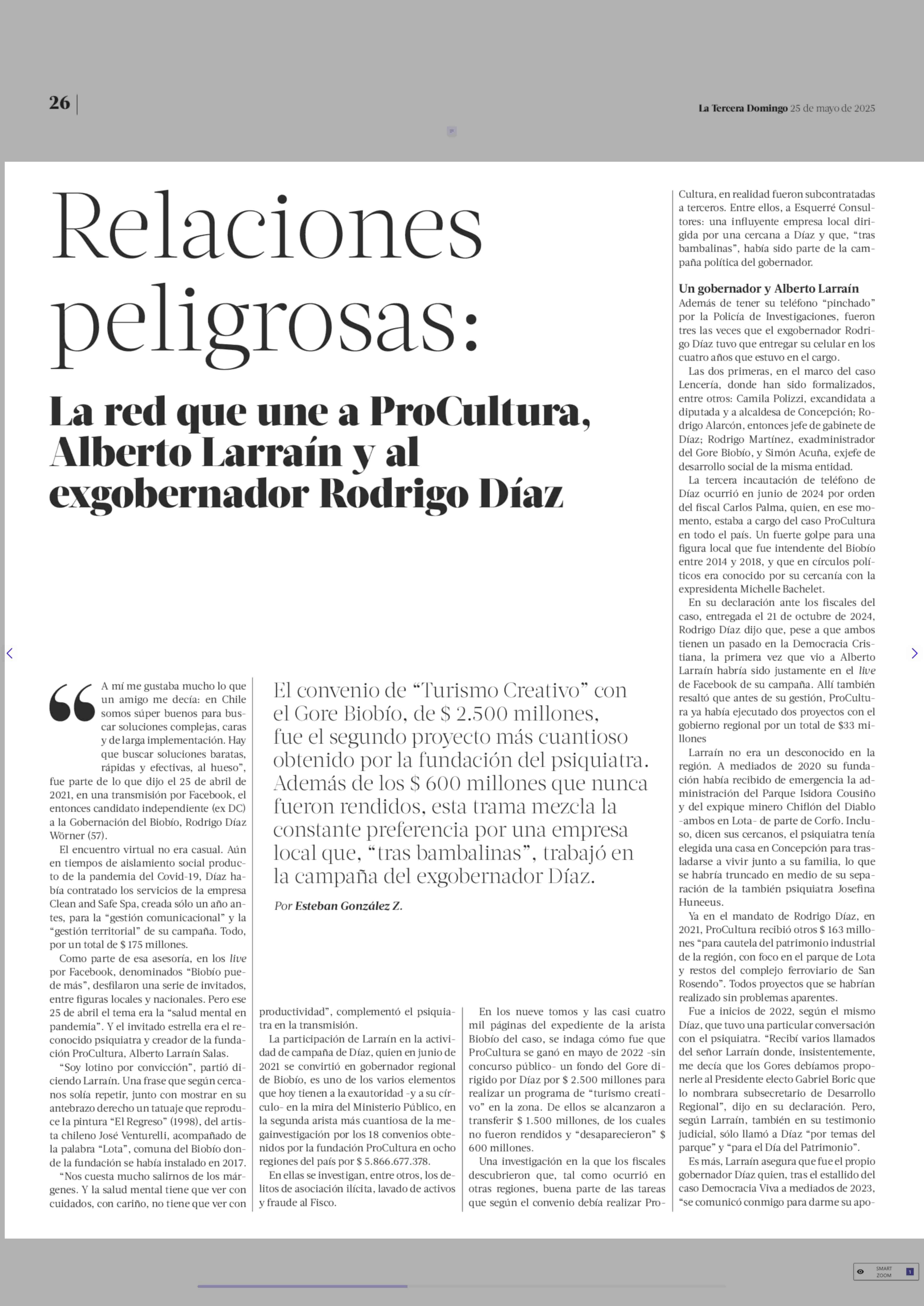 | Título: | Relaciones peligrosas: La red que une a ProCultura, Alberto Larraín y al exgobernador Rodrigo Díaz |