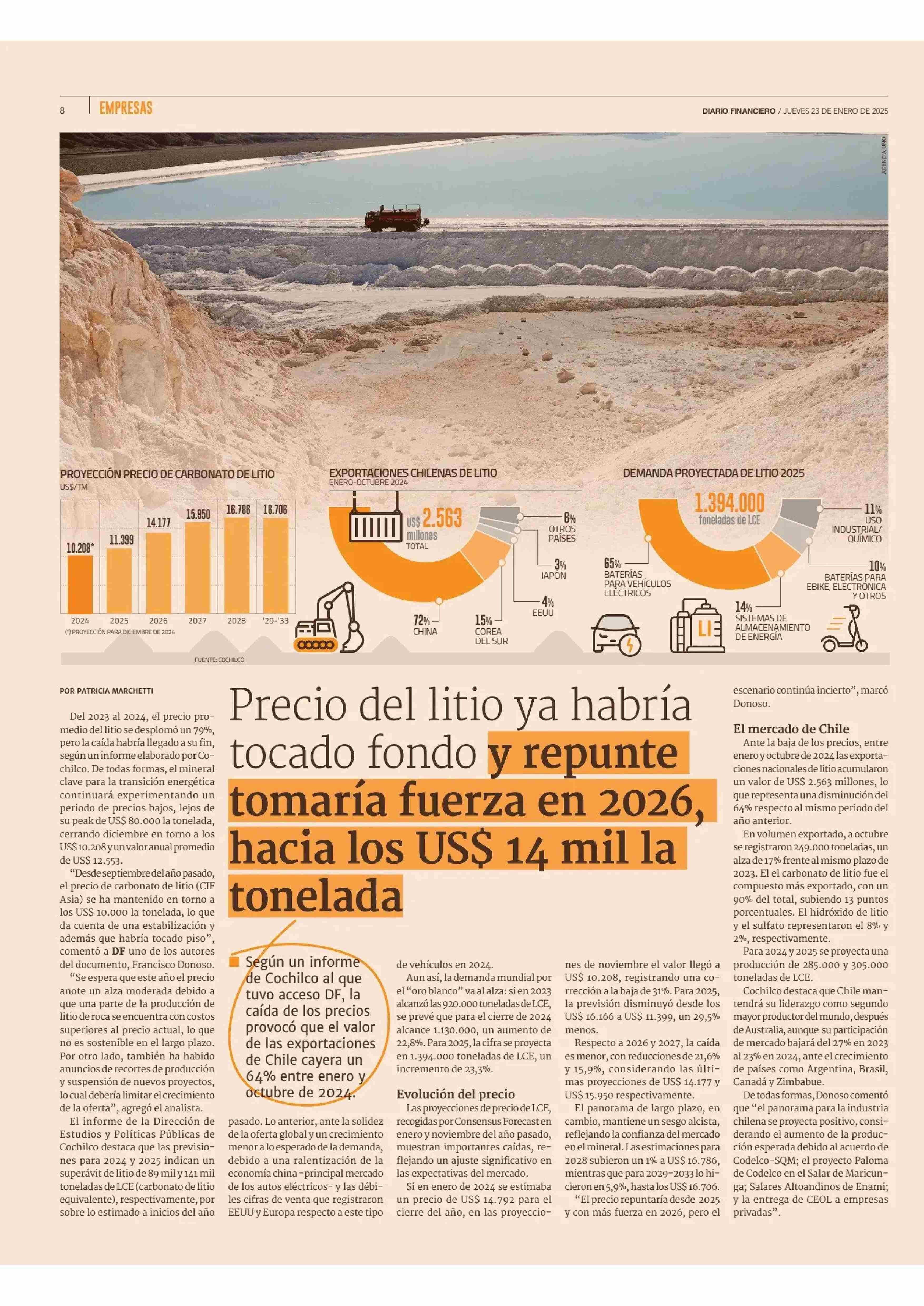 Precio del litio ya habría tocado fondo y repunte tomaría fuerza en , hacia los US$ 14 mil la tonelada 23-01-2025 Diario Financiero |