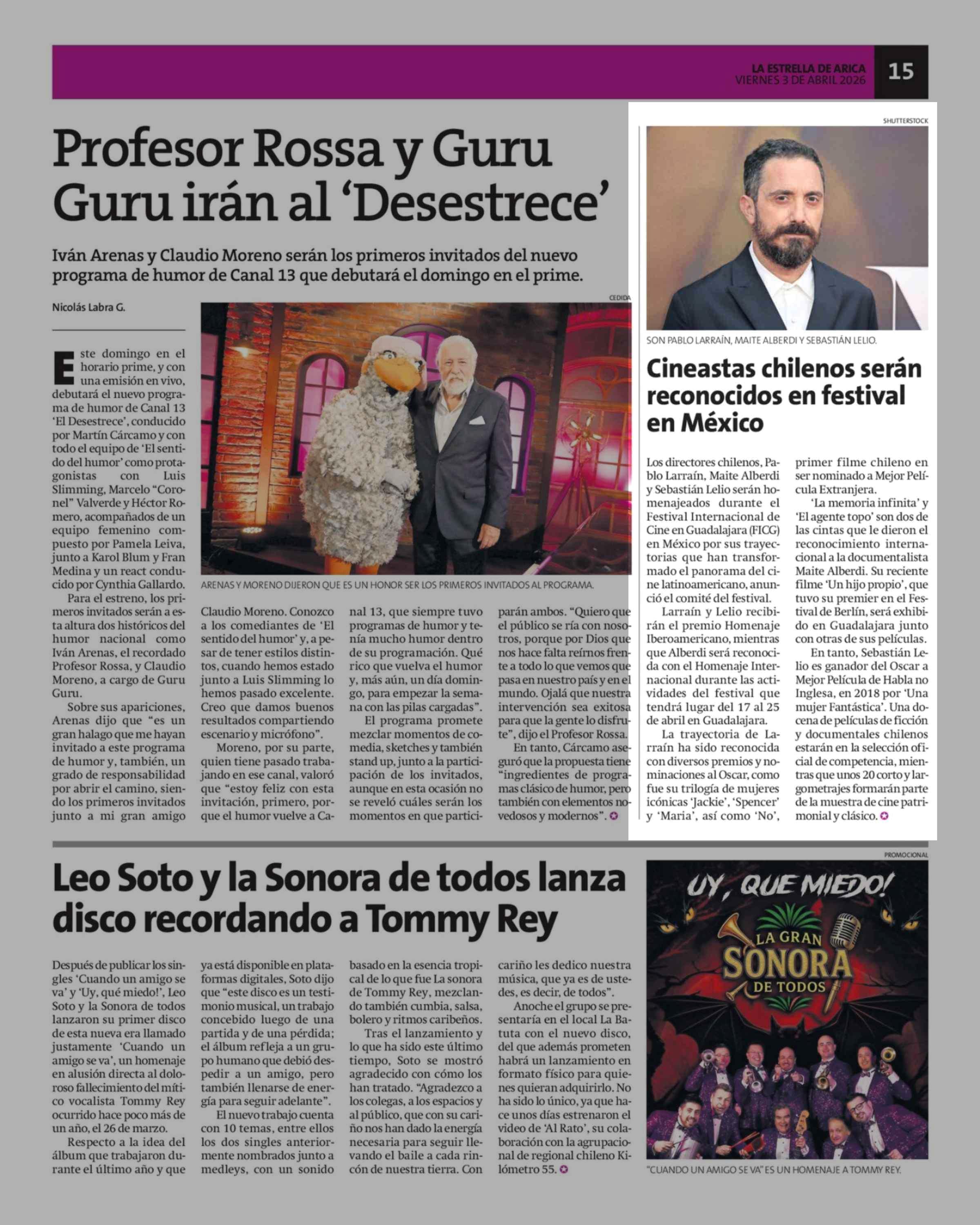 Cineastas chilenos serán reconocidos en festival en México 03-04-2026 La Estrella de Arica |