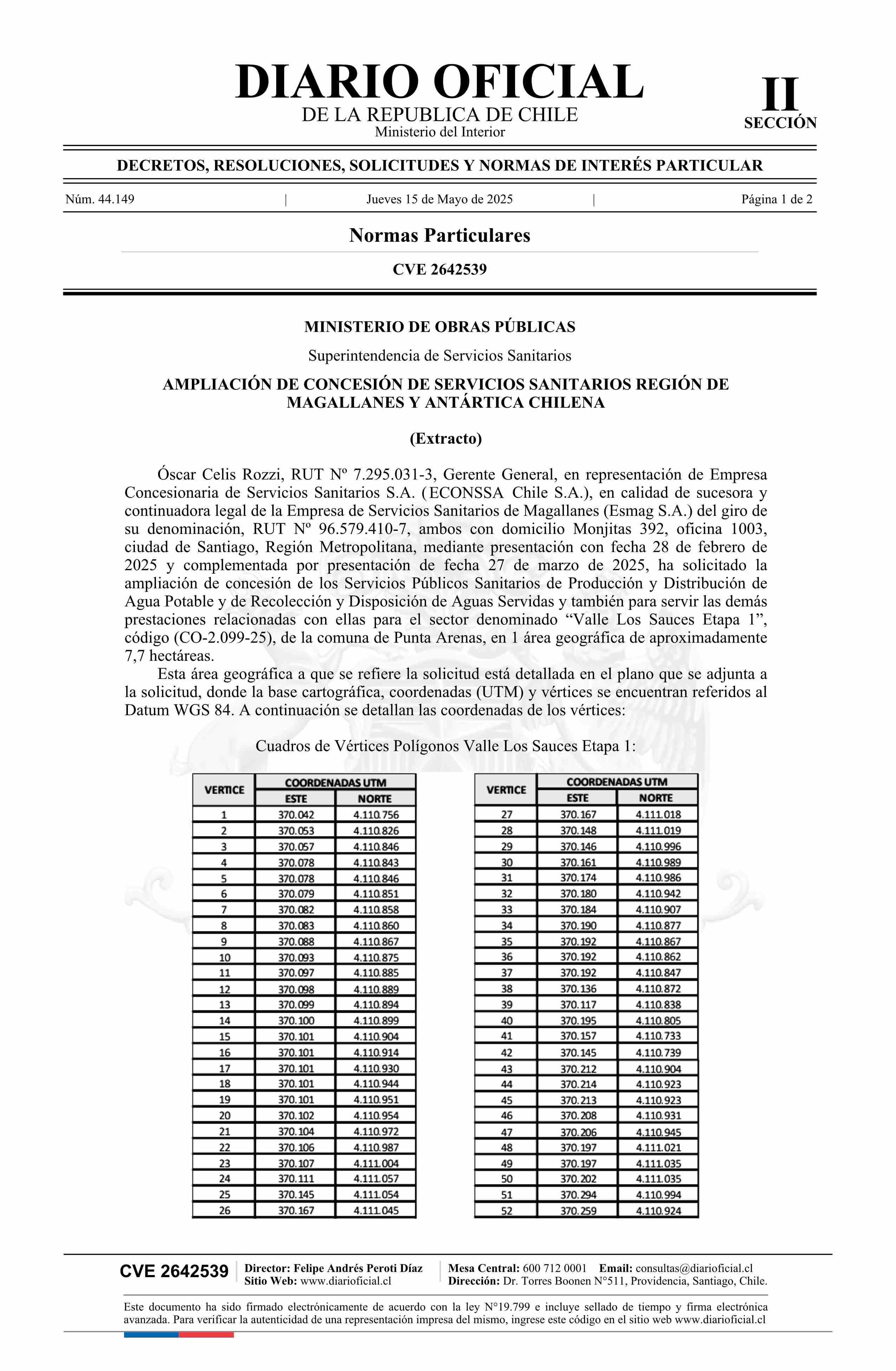 Solicitud de ampliación de concesión de servicios sanitarios de producción y distribución de agua potable y recolección y disposición de aguas servidas 15-05-2025 Diario Oficial Edición Electrónica |