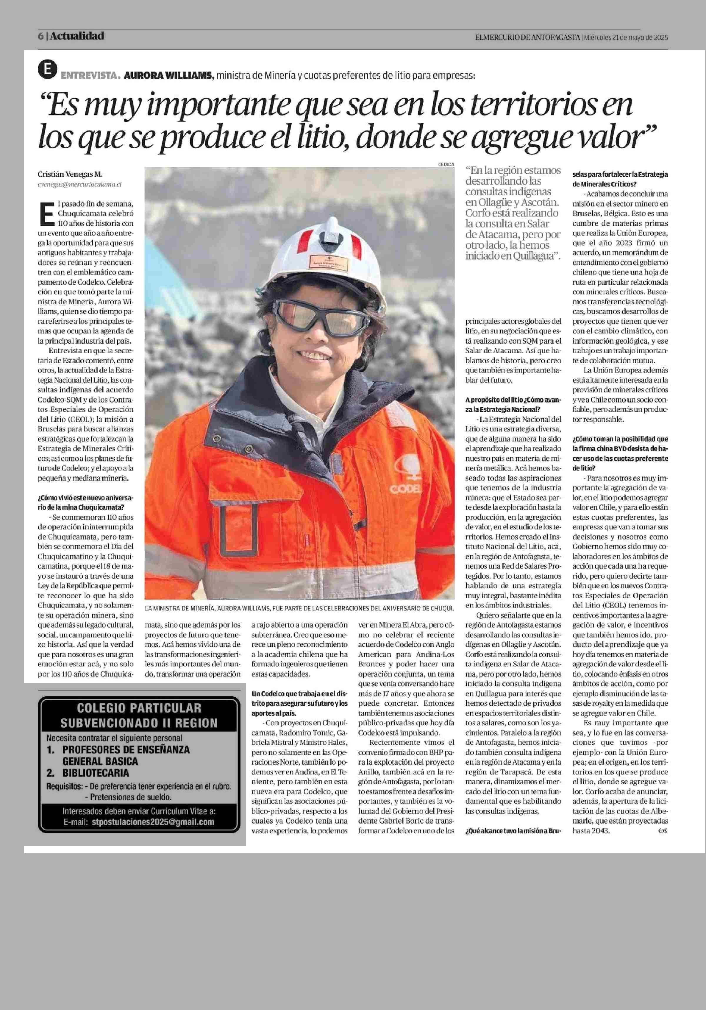 “Es muy importante que sea en los territorios en los que se produce el litio, donde se agregue valor” 21-05-2025 El Mercurio de Antofagasta |