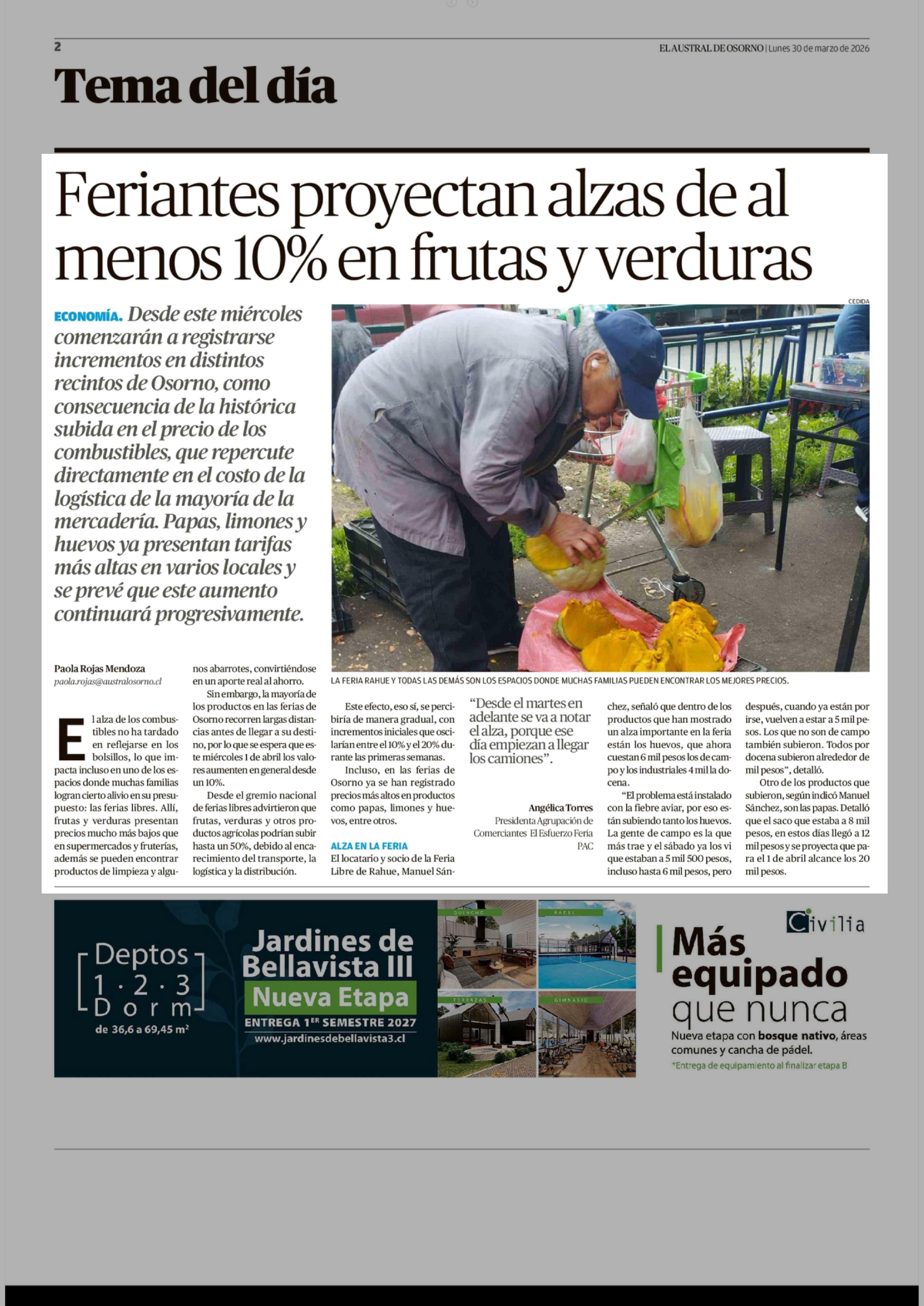 Feriantes proyectan alzas de al menos 10% en frutas y verduras 30-03-2026 El Austral de Osorno |