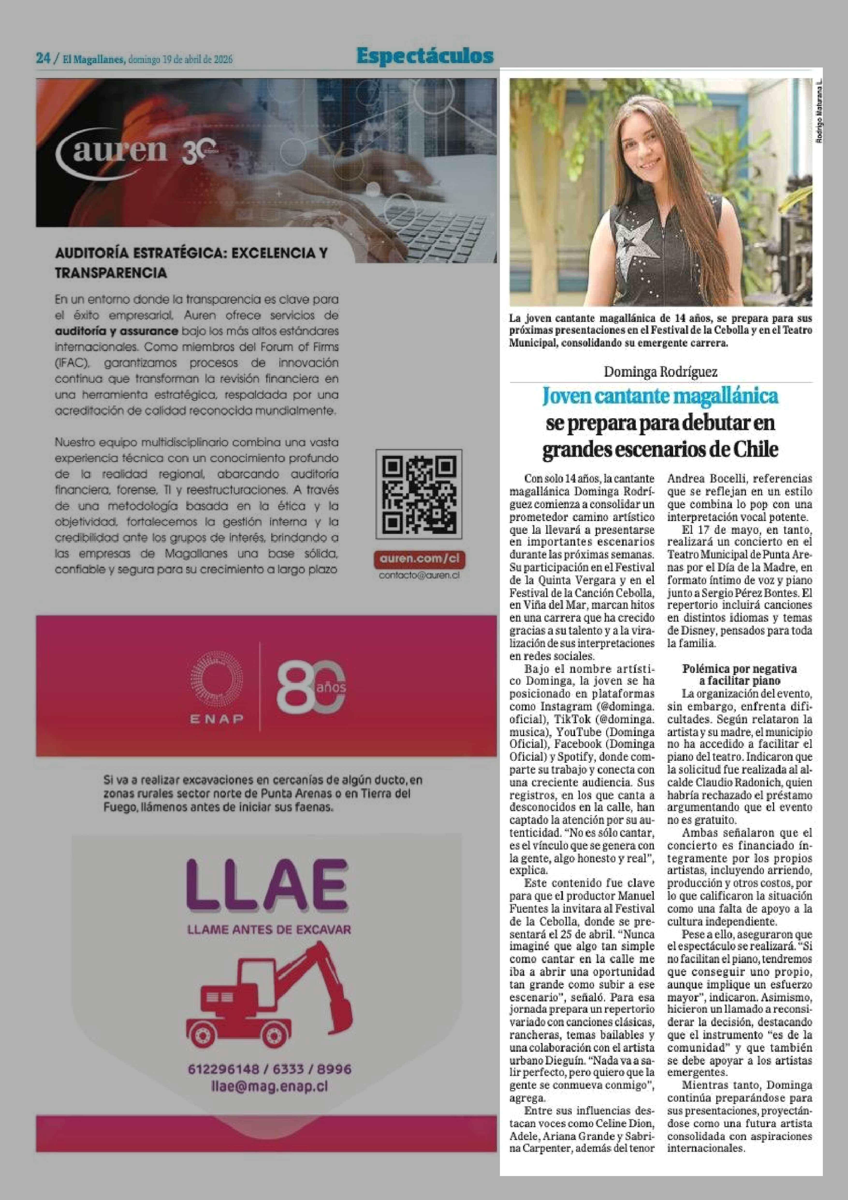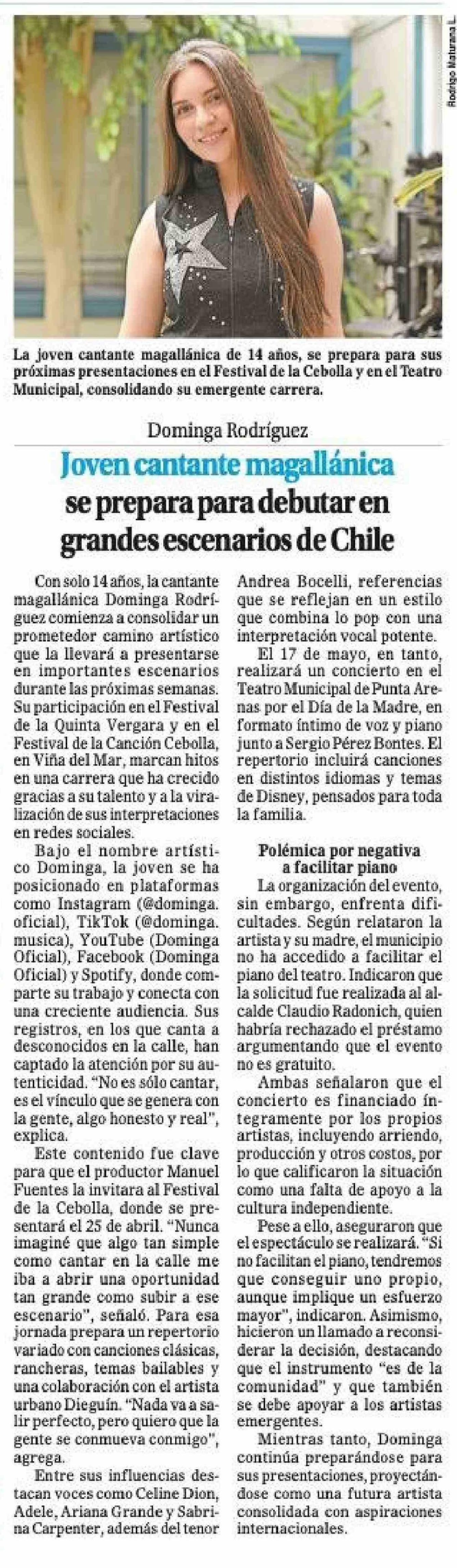 Dominga Rodríguez Joven cantante magallánica se prepara para debutar en grandes escenarios de Chile 19-04-2026 El Magallanes |
