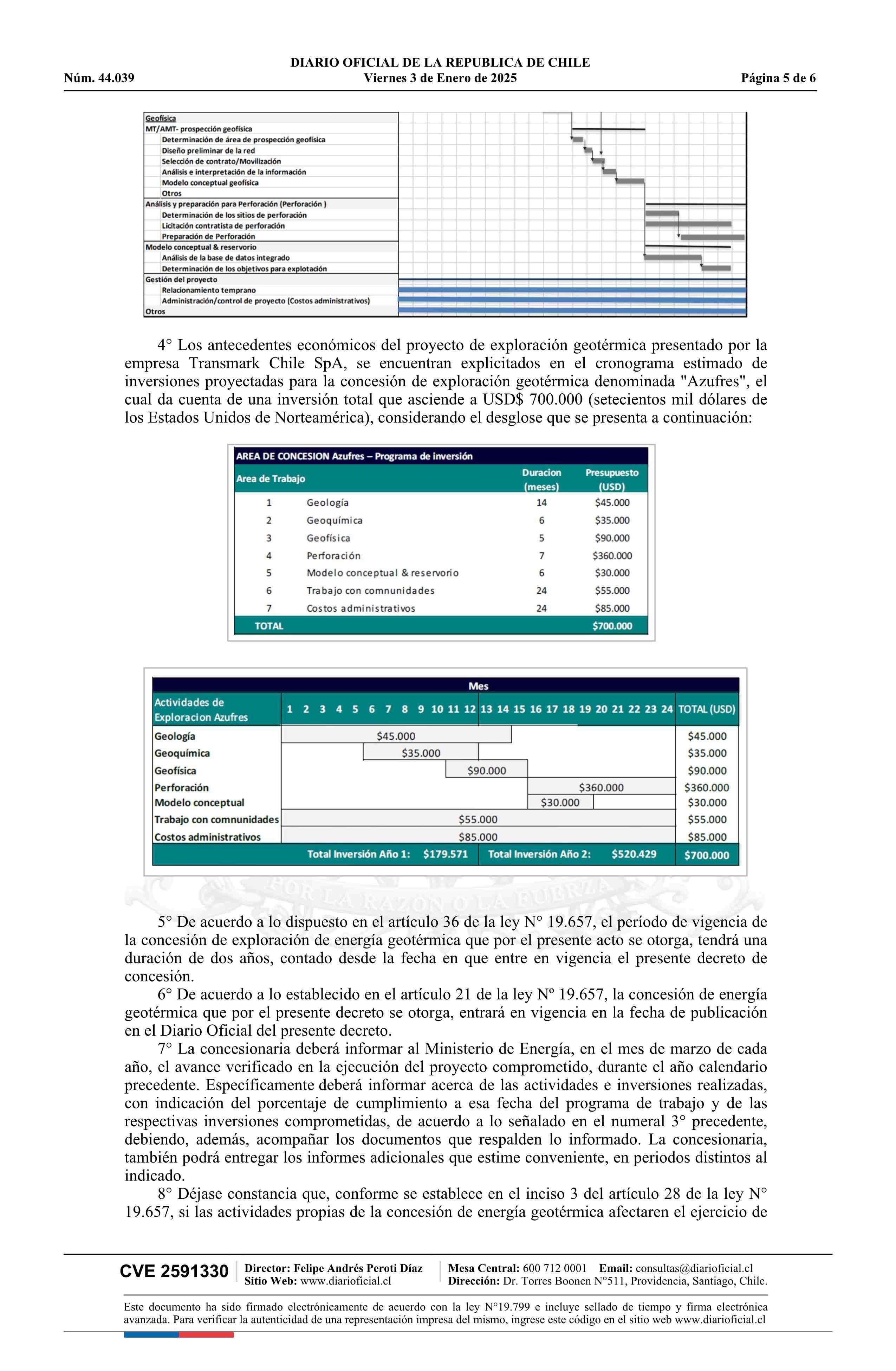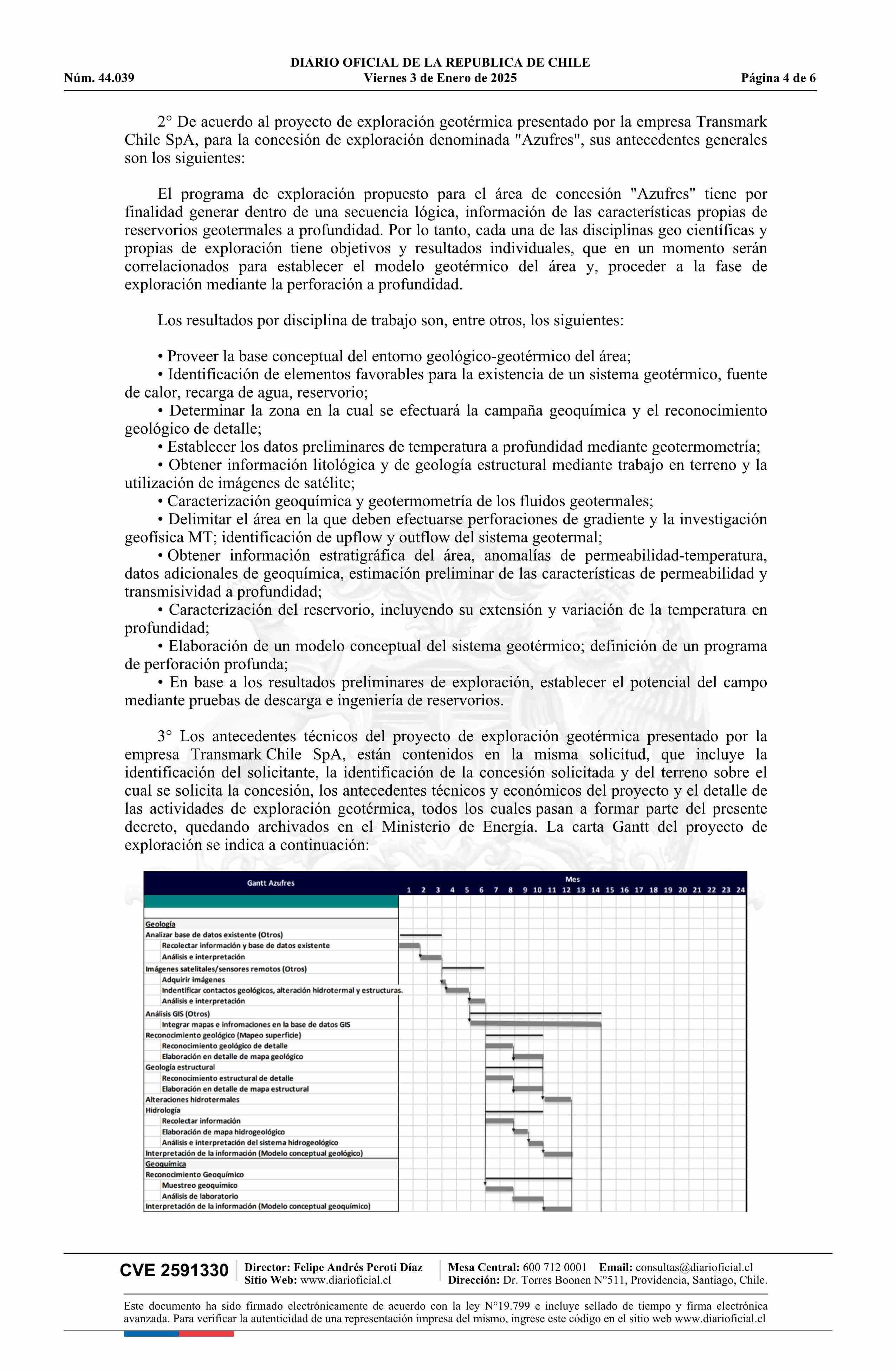 | Título: | Decreto número 3, de 2023.- Otorga a la empresa Transmark Chile SpA, concesión de exploración de energía geotérmica denominada Azufres, ubicada en la Región del Libertador General Bernardo O'Higgins, provincia de Colchagua, comuna de San Fernando, en virtud de la ley N° 19.657 |