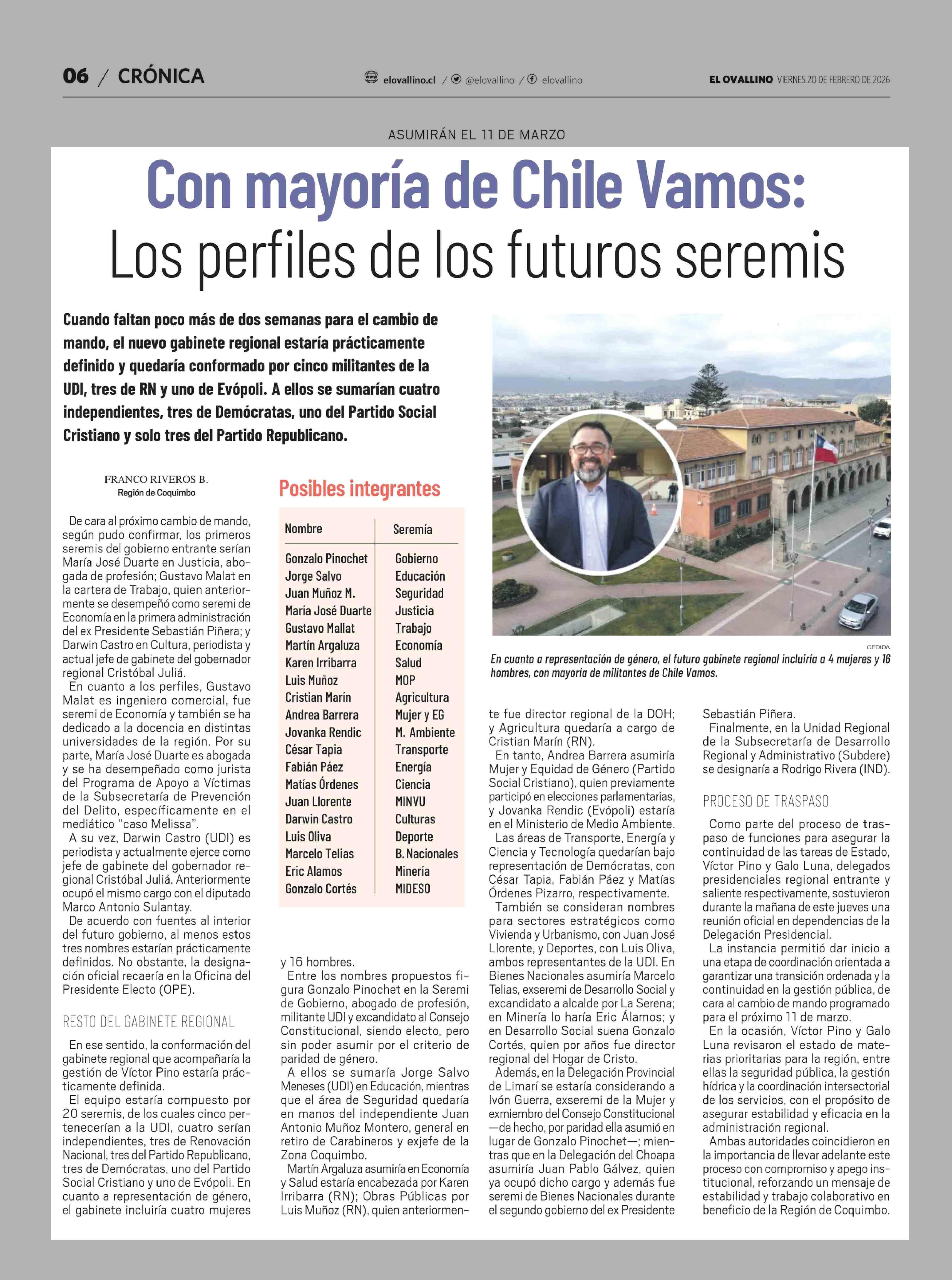 Con mayoría de Chile Vamos: Los perfiles de los futuros seremis 20-02-2026 El Ovallino |