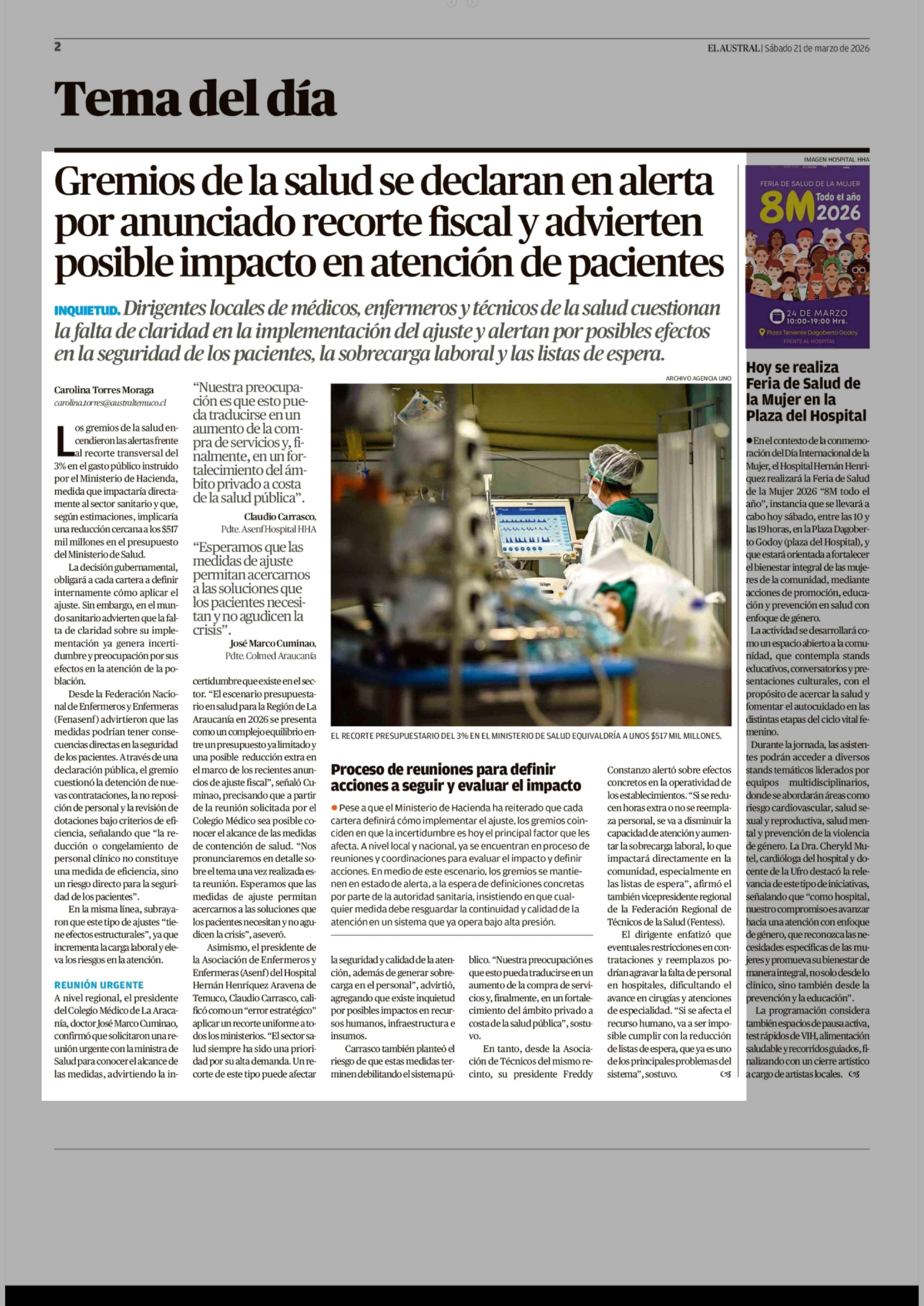Título: Gremios de la salud se declaran en alerta por anunciado recorte fiscal y advierten posible impacto en atención de pacientes