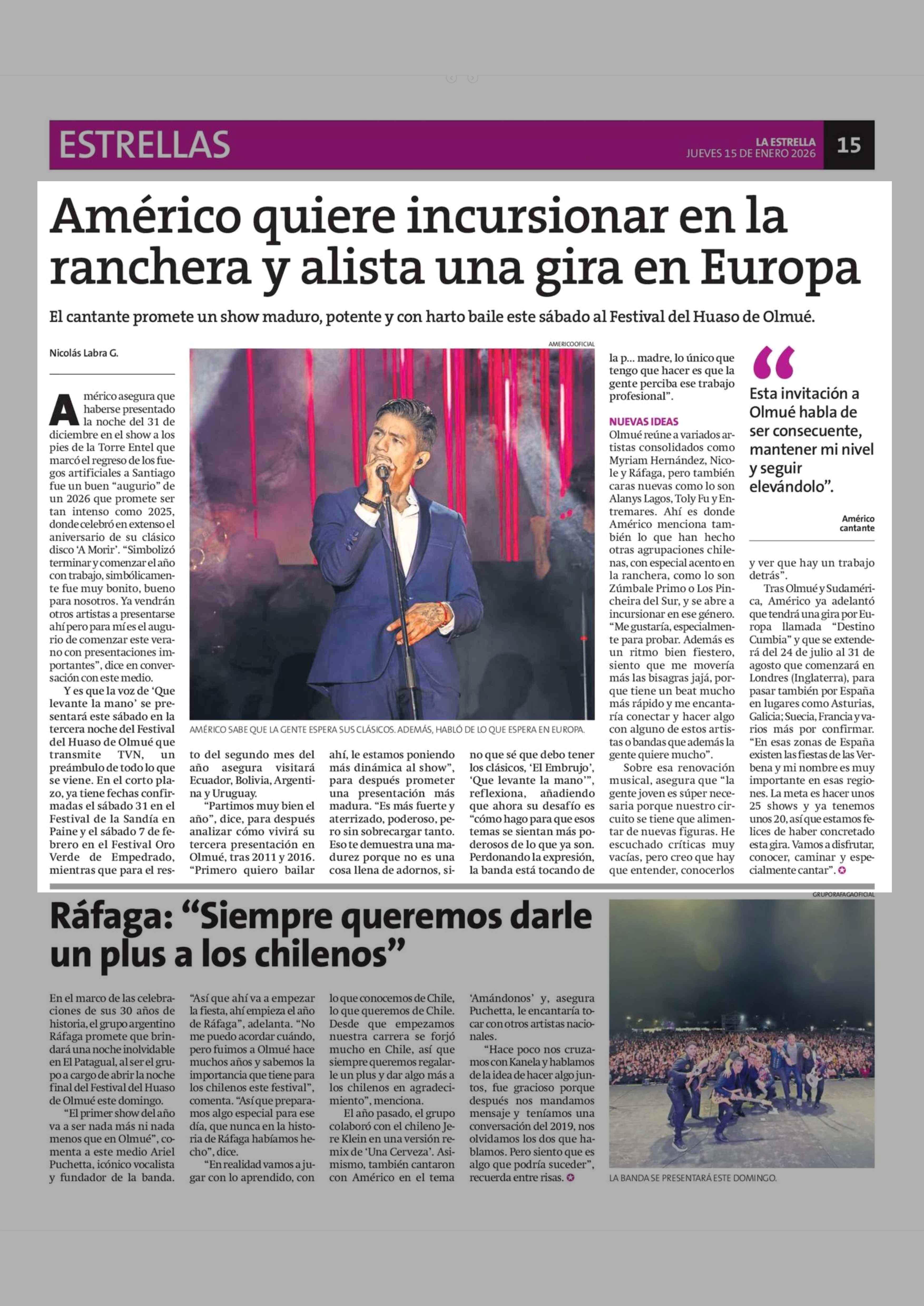 Américo quiere incursionar en la ranchera y alista una gira en Europa 15-01-2026 La Estrella de Concepción |
