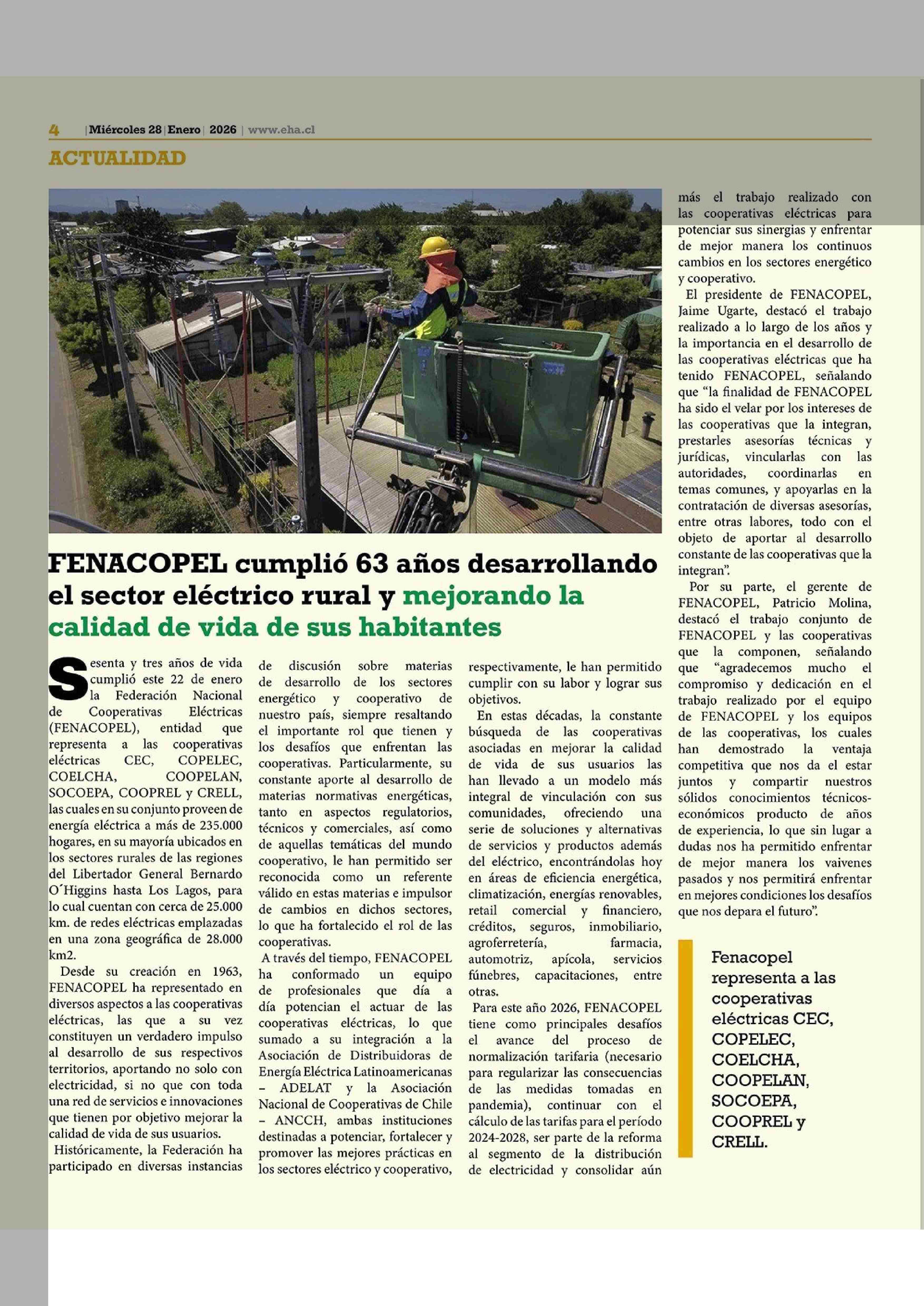 FENACOPEL cumplió 63 años desarrollando el sector eléctrico rural y mejorando la calidad de vida de sus habitantes 28-01-2026 El Heraldo Austral |