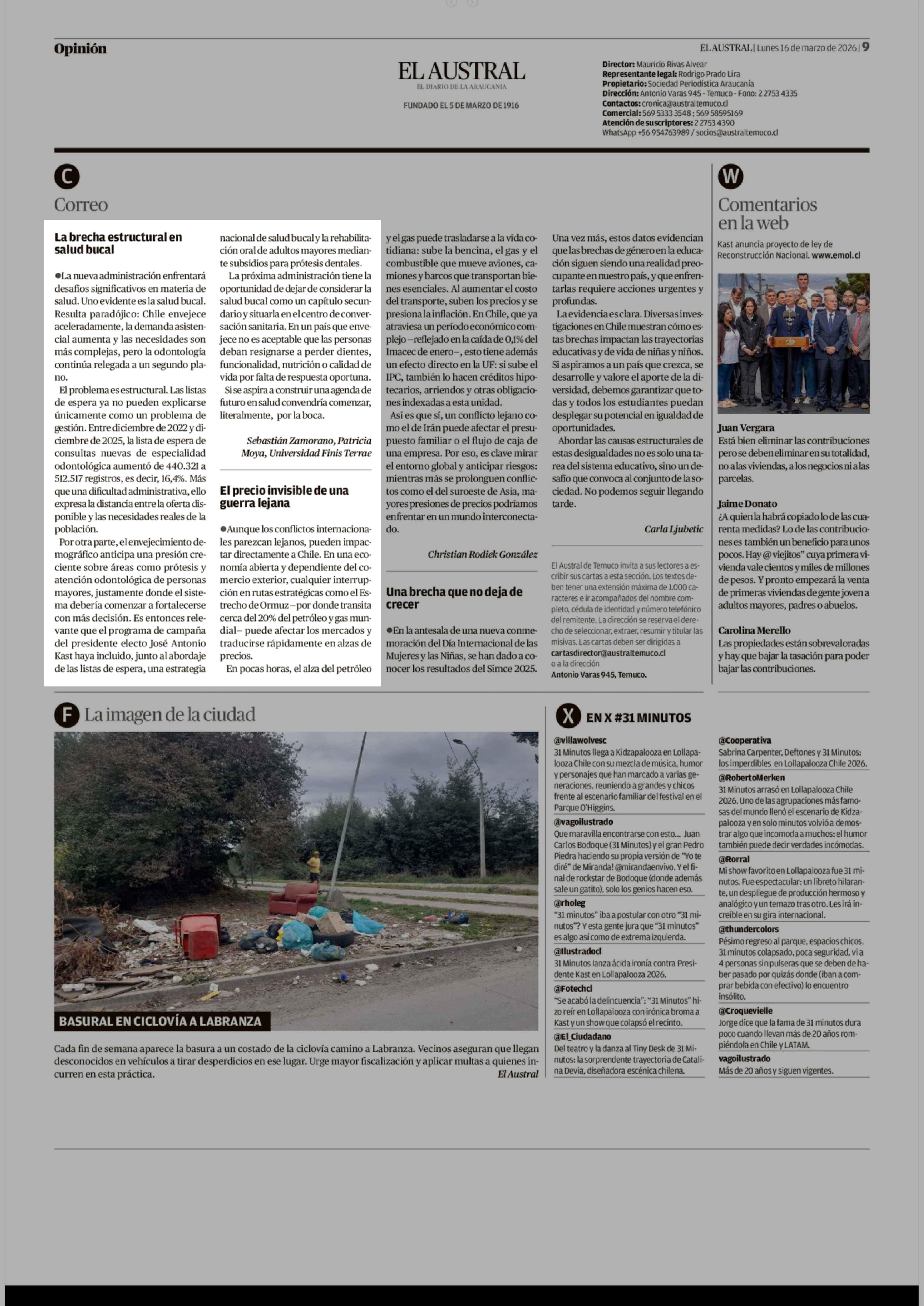 Cartas: La brecha estructural en salud bucal 16-03-2026 El Austral de la Araucanía |