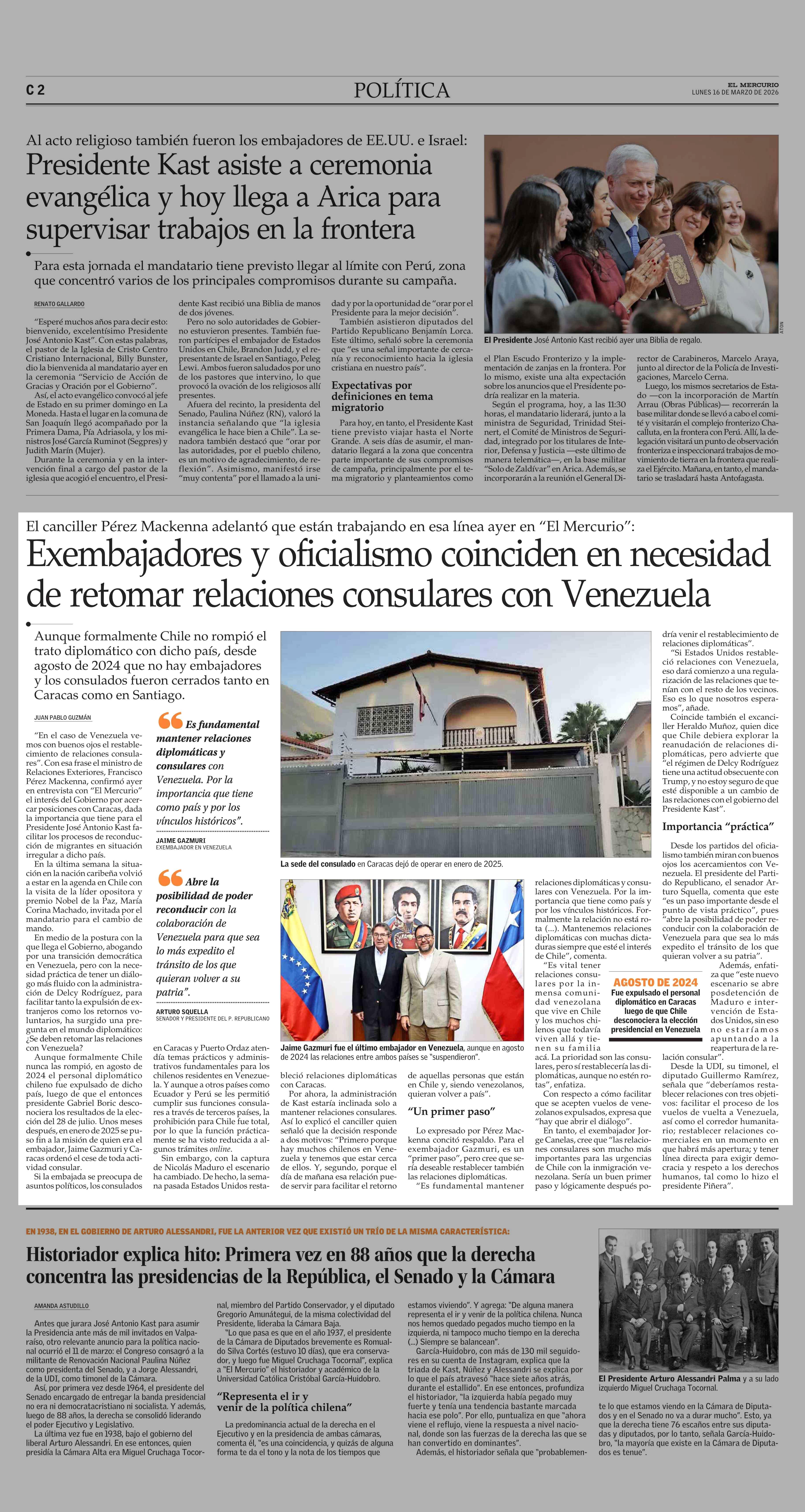 Exembajadores y oficialismo coinciden en necesidad de retomar relaciones consulares con Venezuela 16-03-2026 El Mercurio |