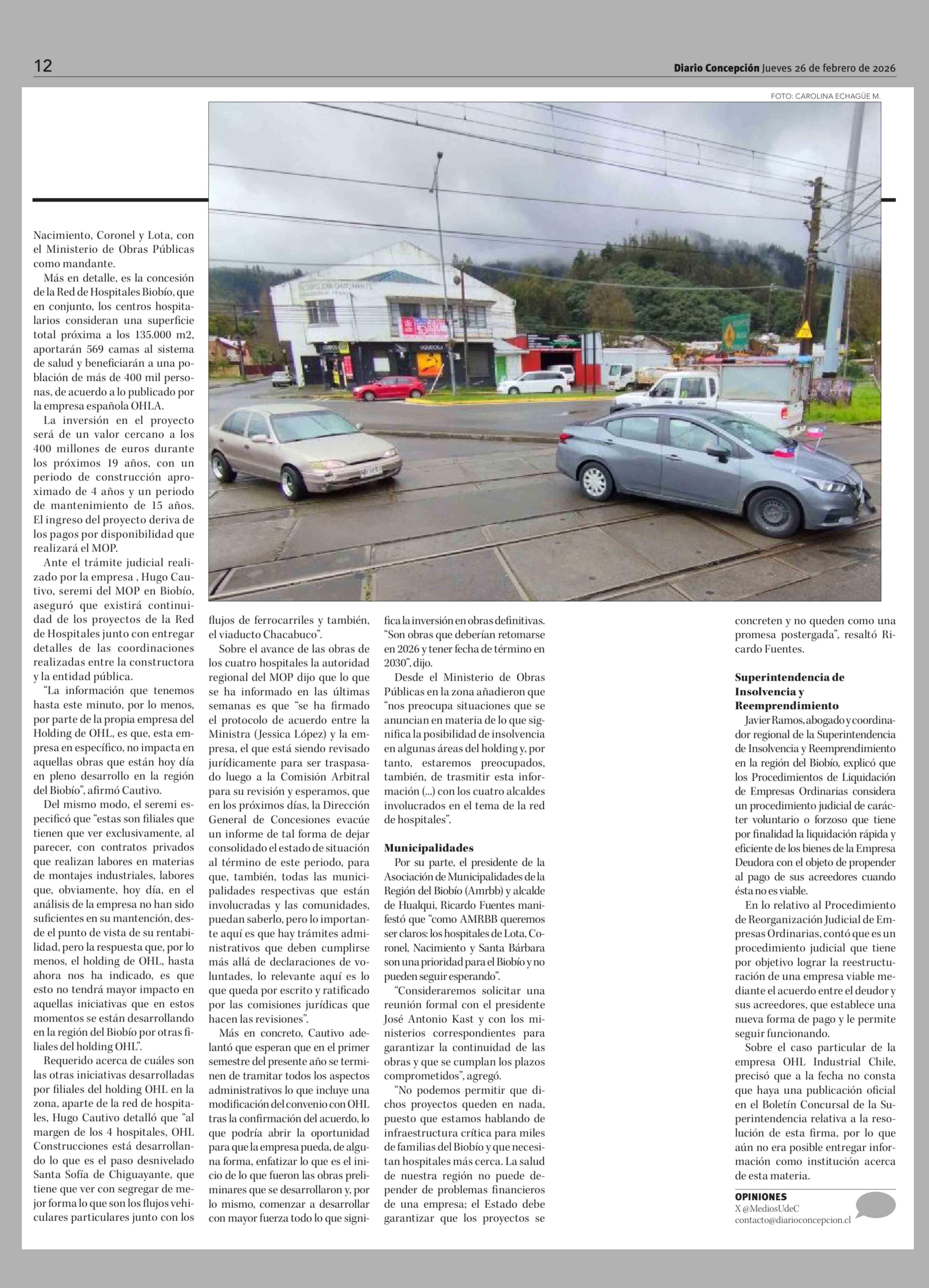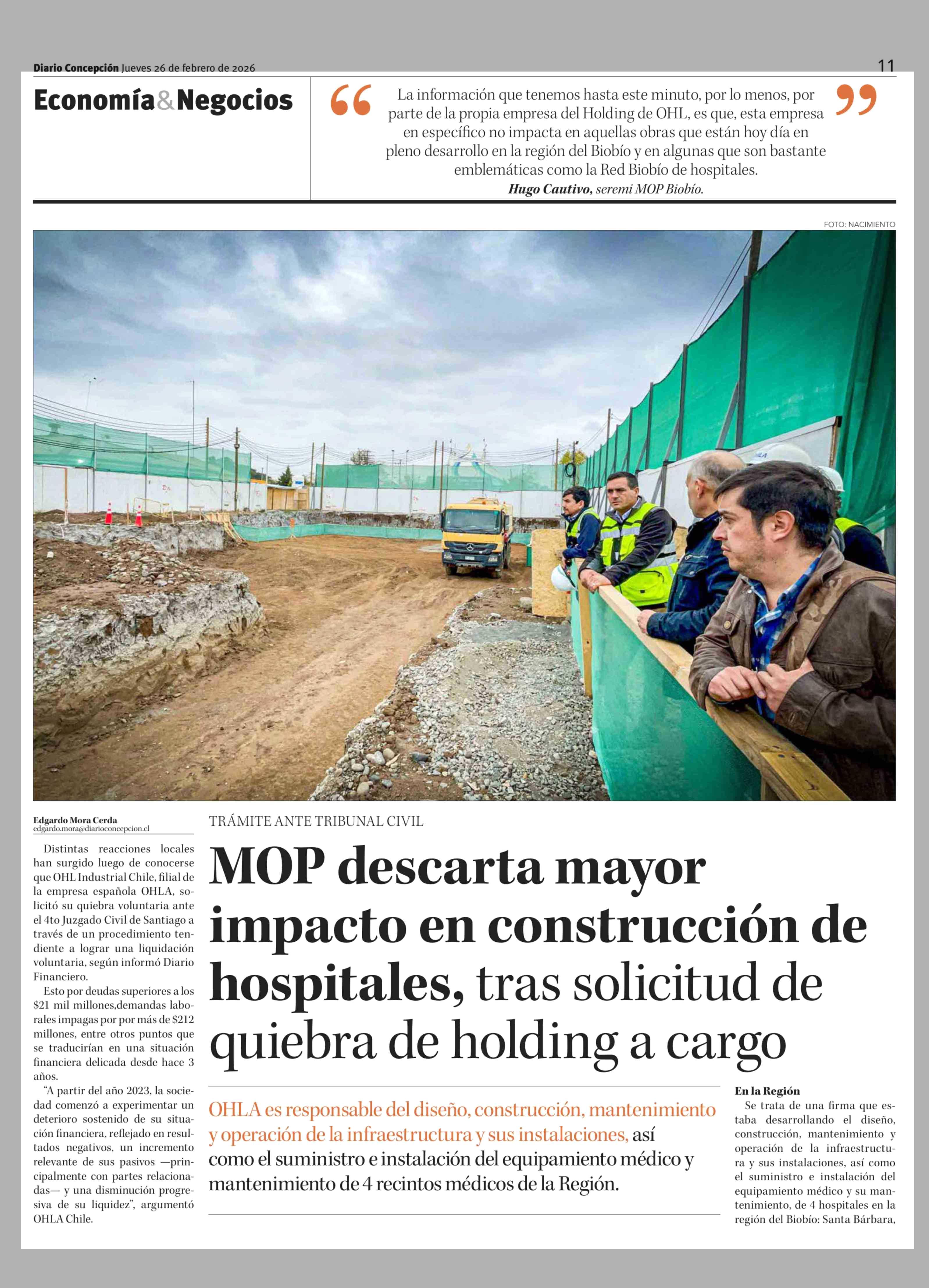 MOP descarta mayor impacto en construcción de hospitales, tras solicitud de quiebra de holding a cargo 26-02-2026 Diario Concepción |