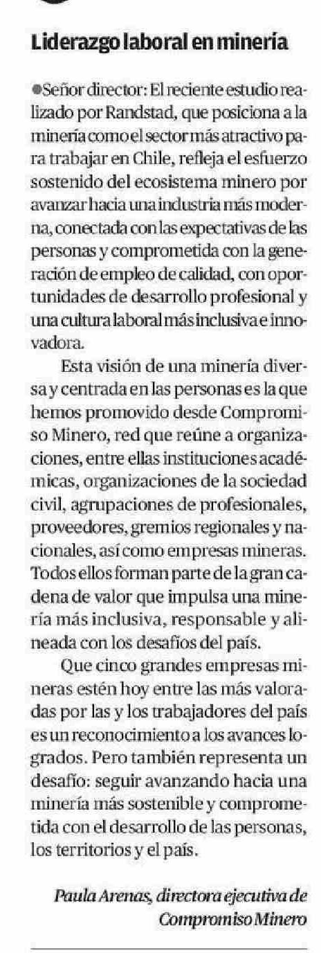 | Título: | Cartas: Liderazgo laboral en mineria ·Señor director: El reciente estudio realizado por Randstad, que posiciona a la minería como el sector más atractivo para trabajar en Chile, refleja el esfuerzo sostenido del ecosistema minero por avanzar hacia una industria mas moderna, conectada con las expecta |