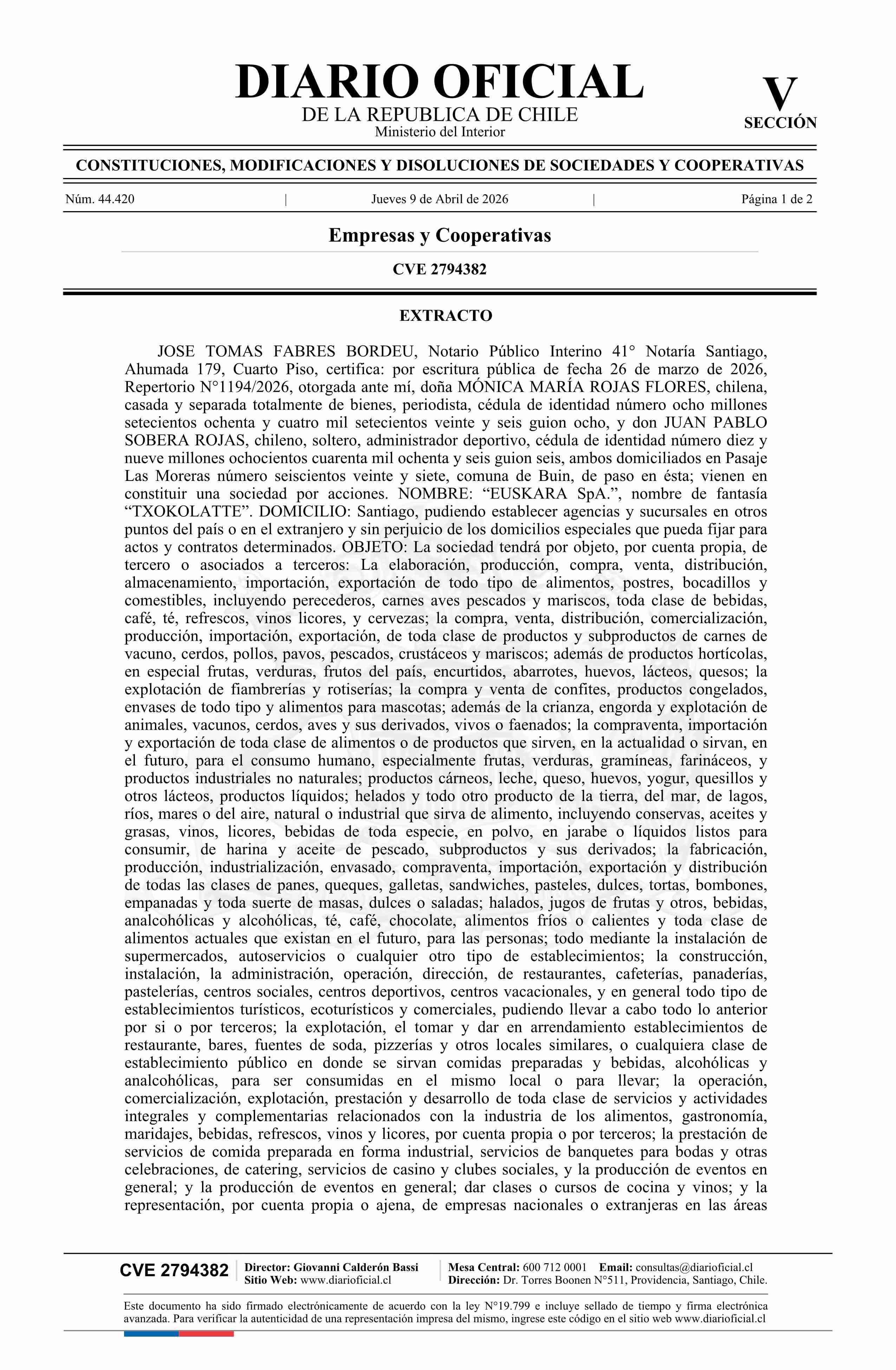 EUSKARA SpA 09-04-2026 Diario Oficial Edición Electrónica |