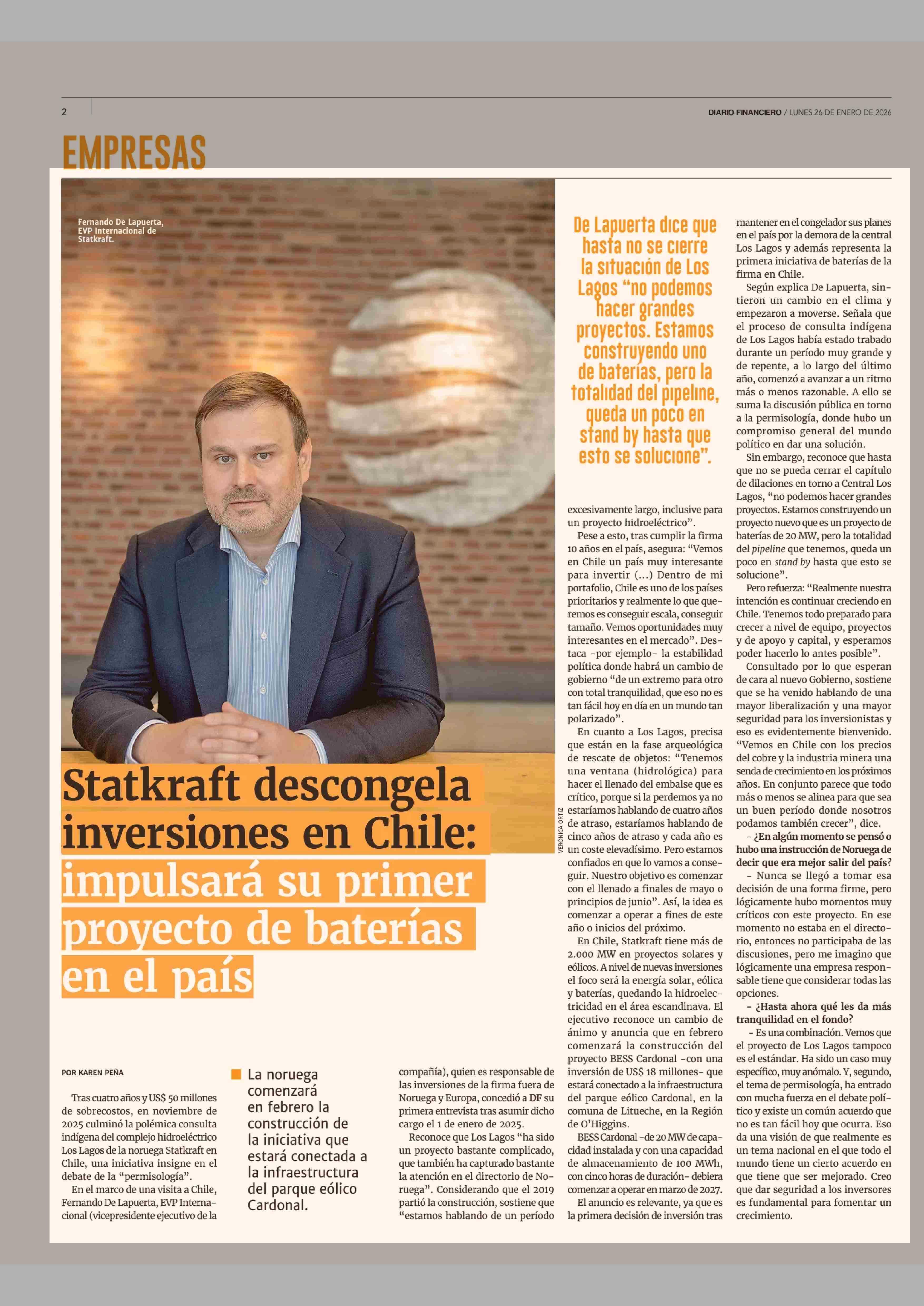 Statkraft descongela inversiones en Chile: impulsará su primer proyecto de baterías en el país 26-01-2026 Diario Financiero |