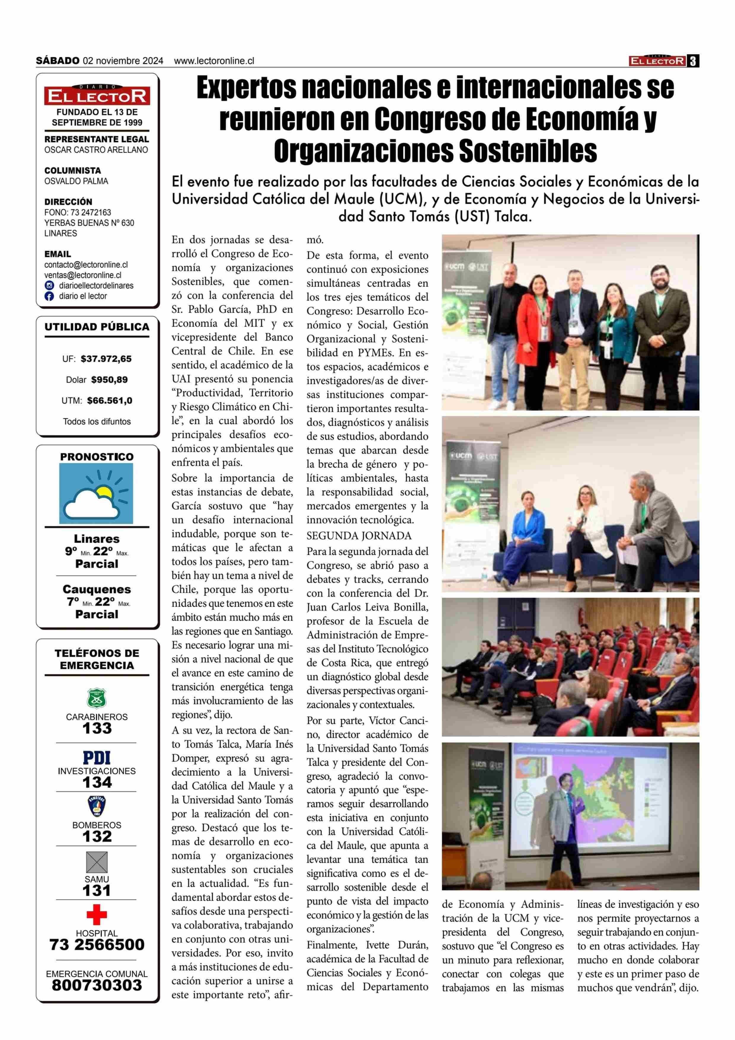 Expertos nacionales e internacionales se reunieron en Congreso de Economía y Oruanizaciones Sostenibles 02-11-2024 El Lector |