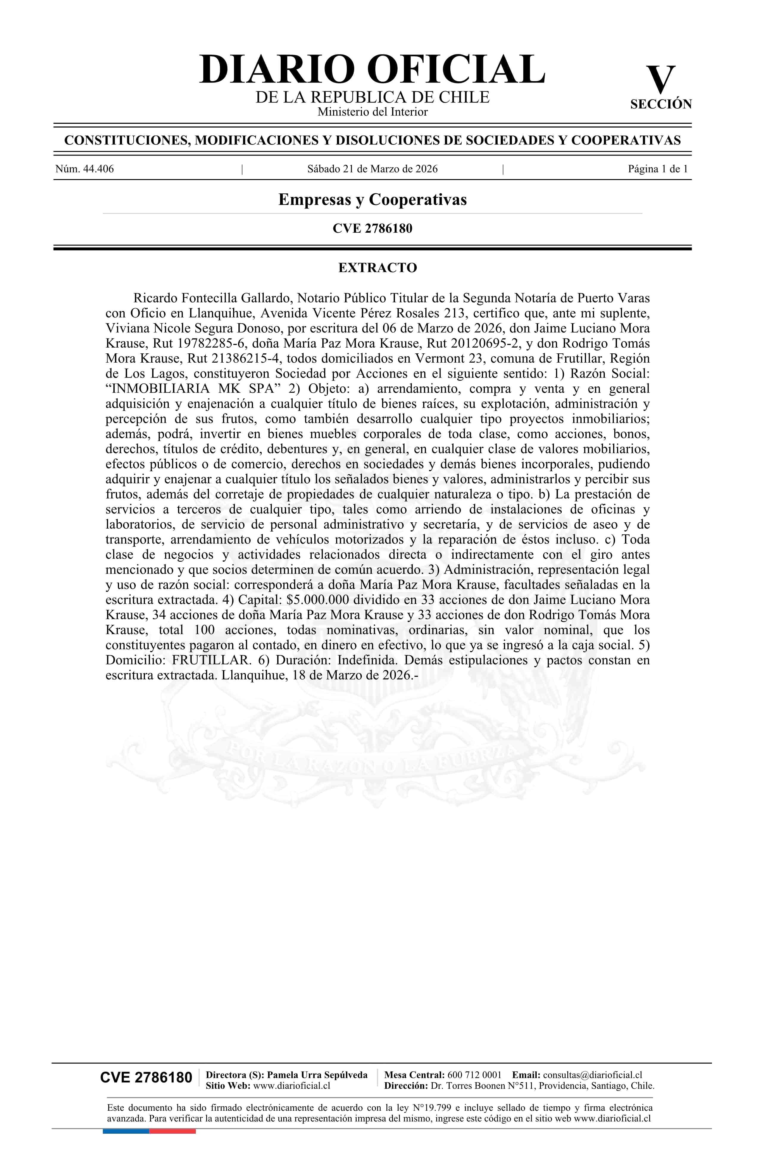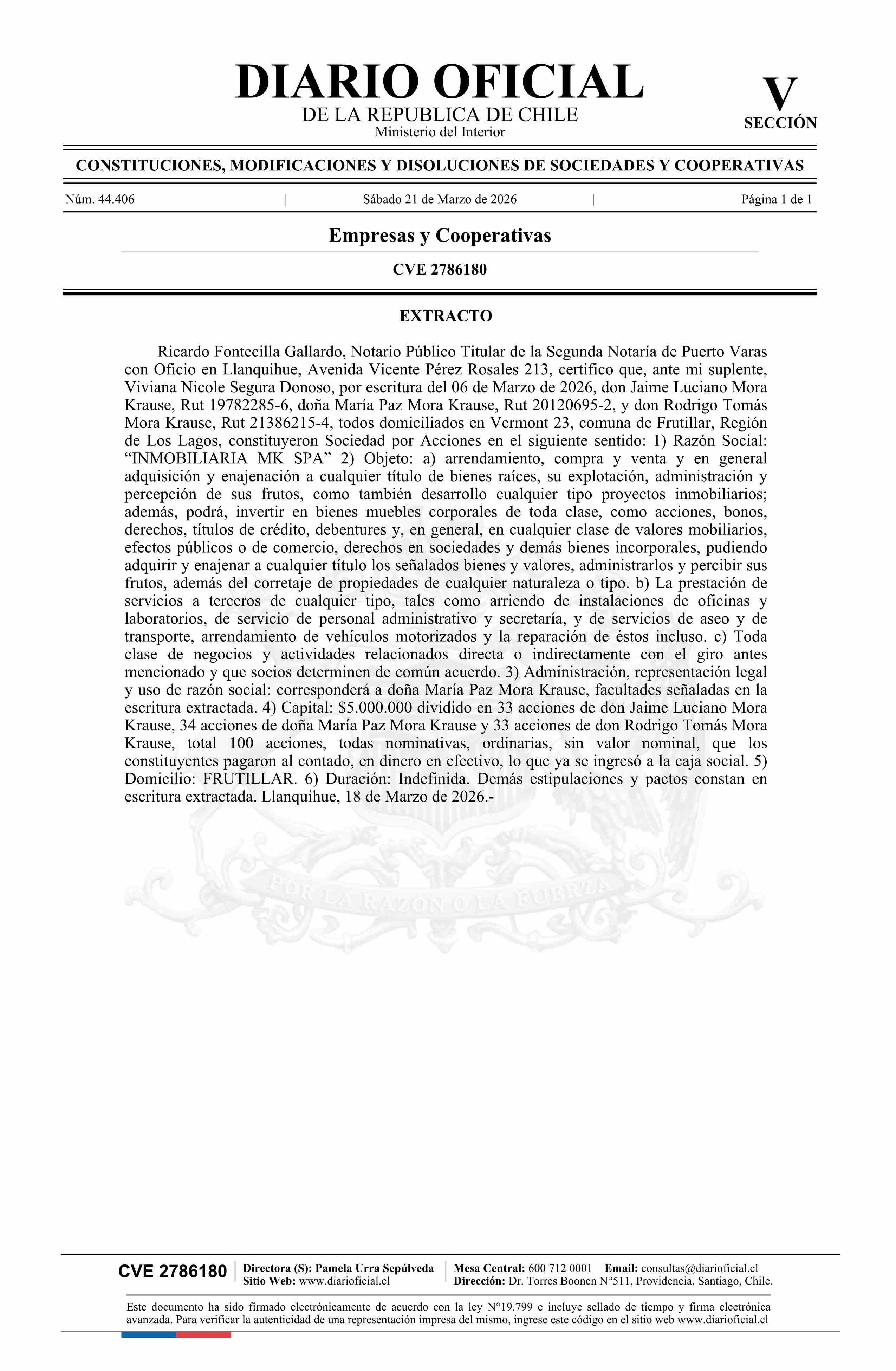 Inmobiliaria MK SpA 21-03-2026 Diario Oficial Edición Electrónica |