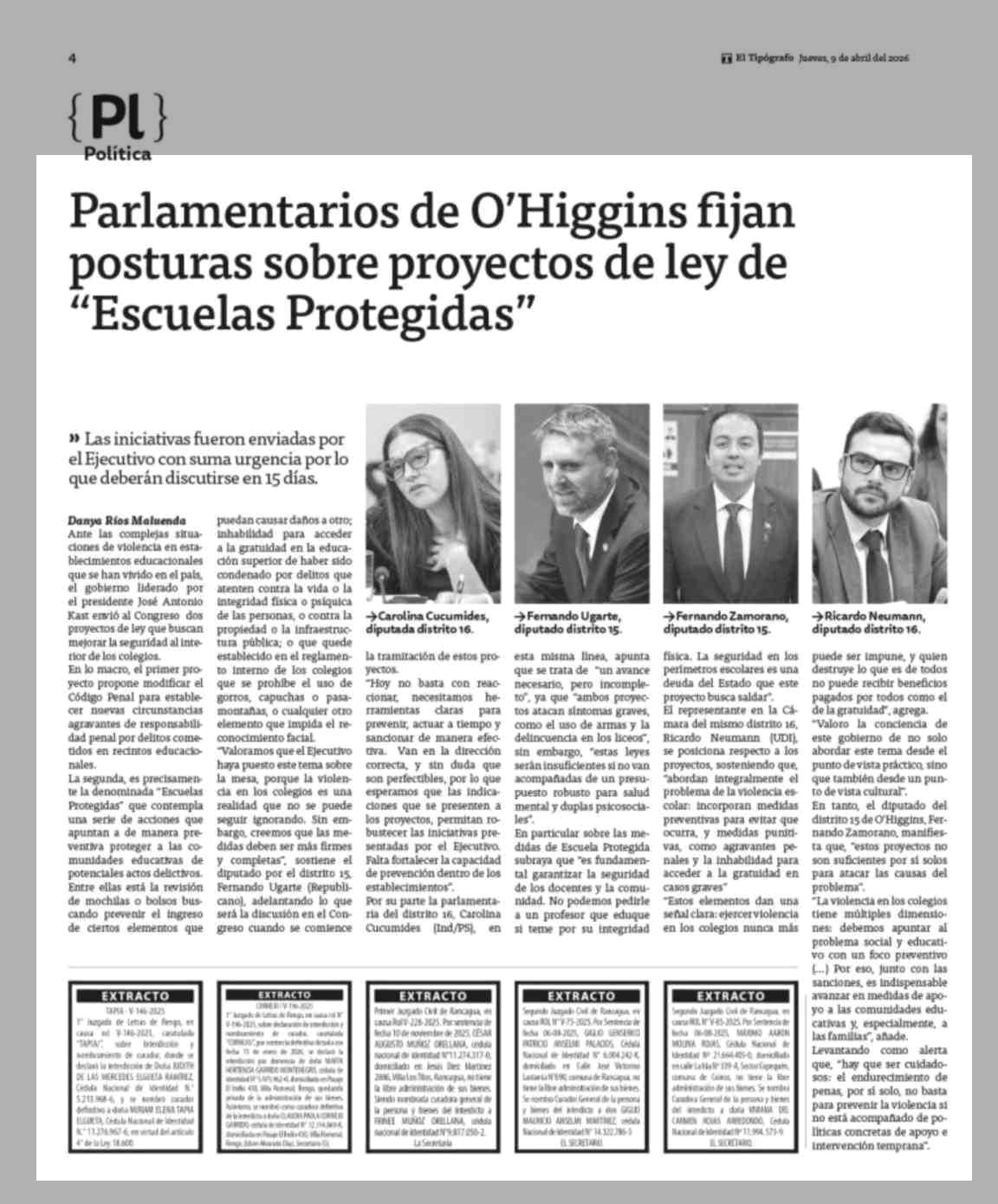 Título: Parlamentarios de O'Higgins fijan posturas sobre proyectos de ley de "Escuelas Protegidas"