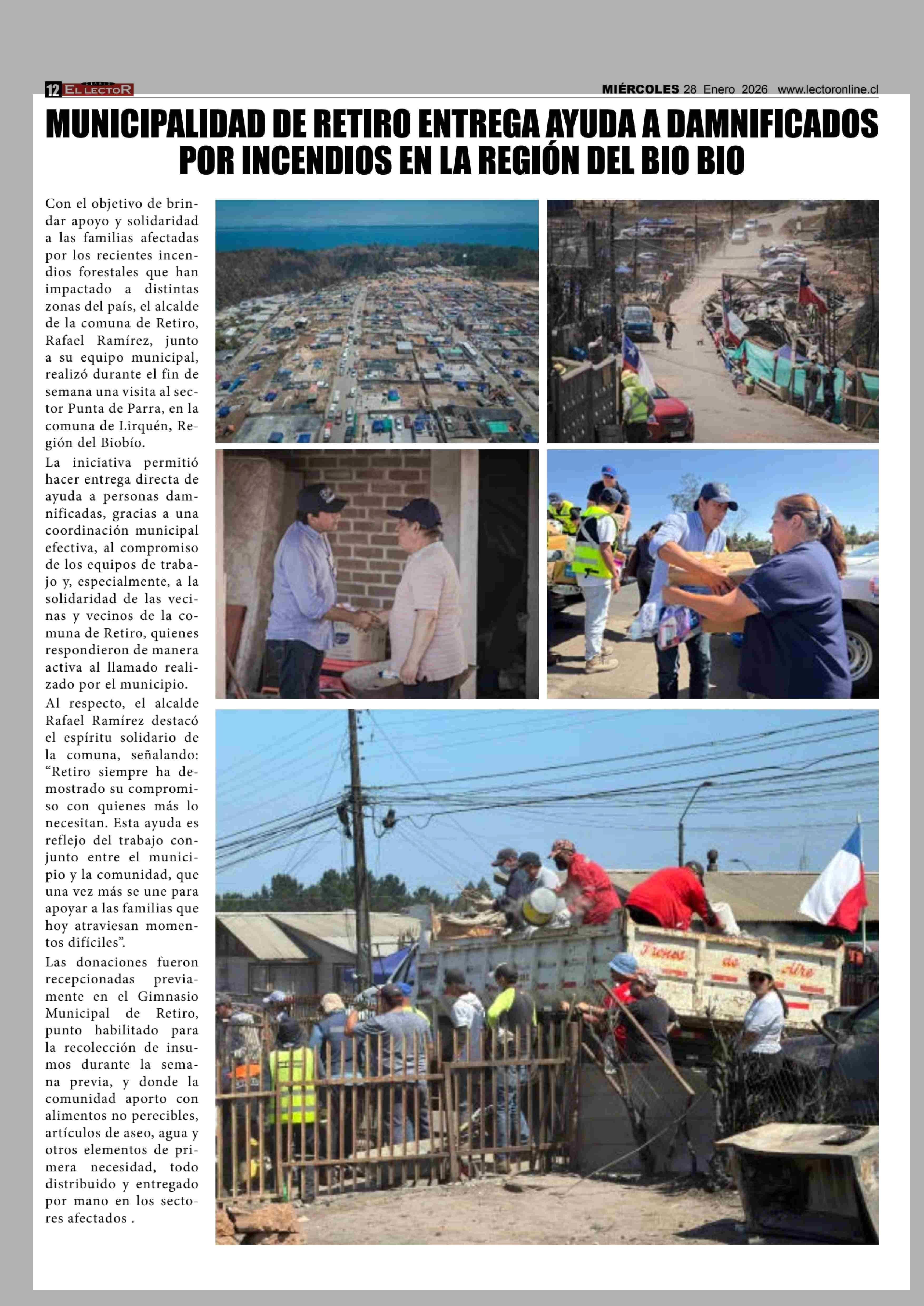 MUNICIPALIDAD DE RETIRO ENTREGA AYUDA A DAMNIFICADOS POR INCENDIOS EN LA REGIÓN DEL BIO BIO 28-01-2026 El Lector |