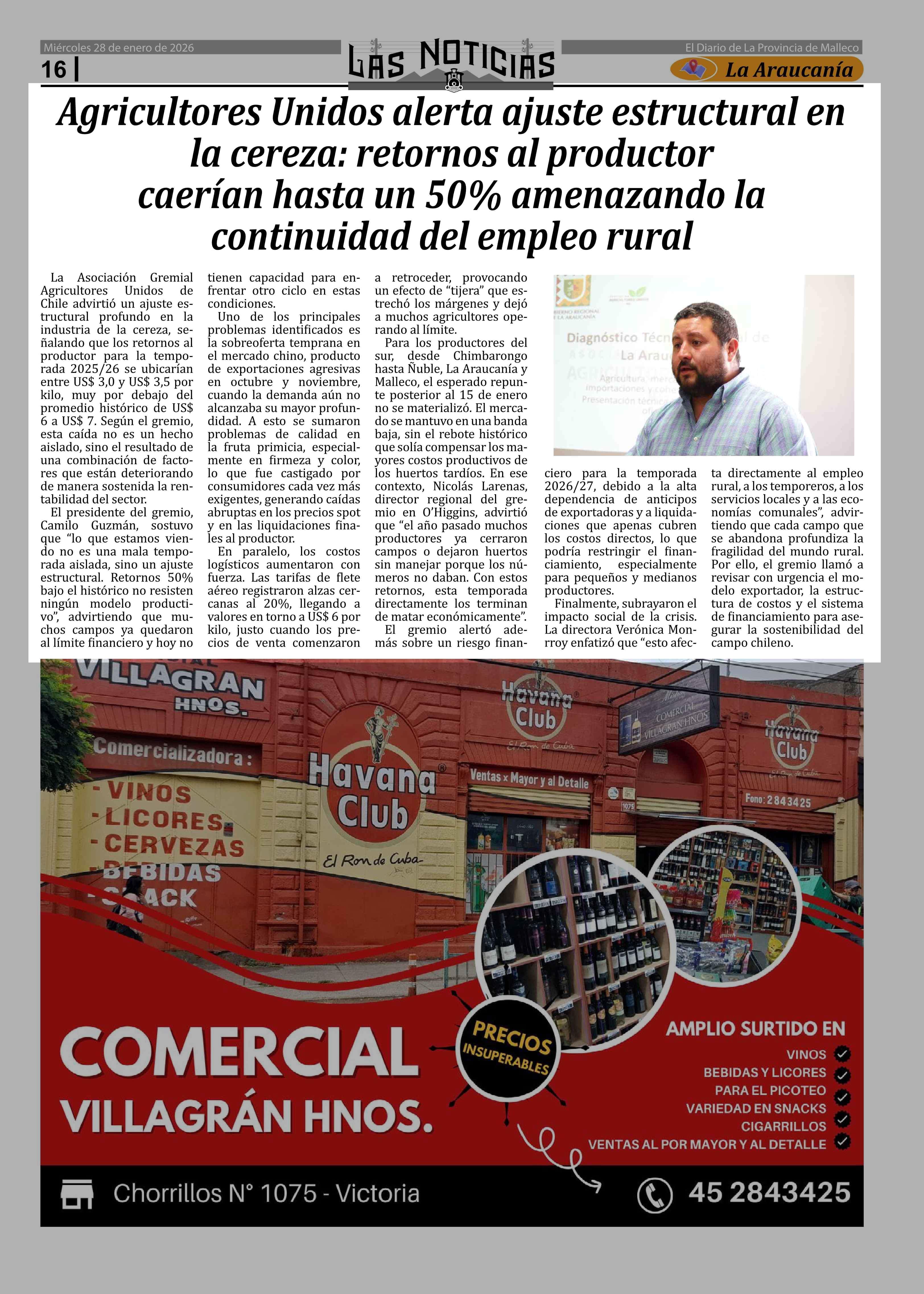 Agricultores Unidos alerta ajuste estructural en la cereza: retornos al productor caerían hasta un 50% amenazando la continuidad del empleo rural 28-01-2026 Las Noticias |