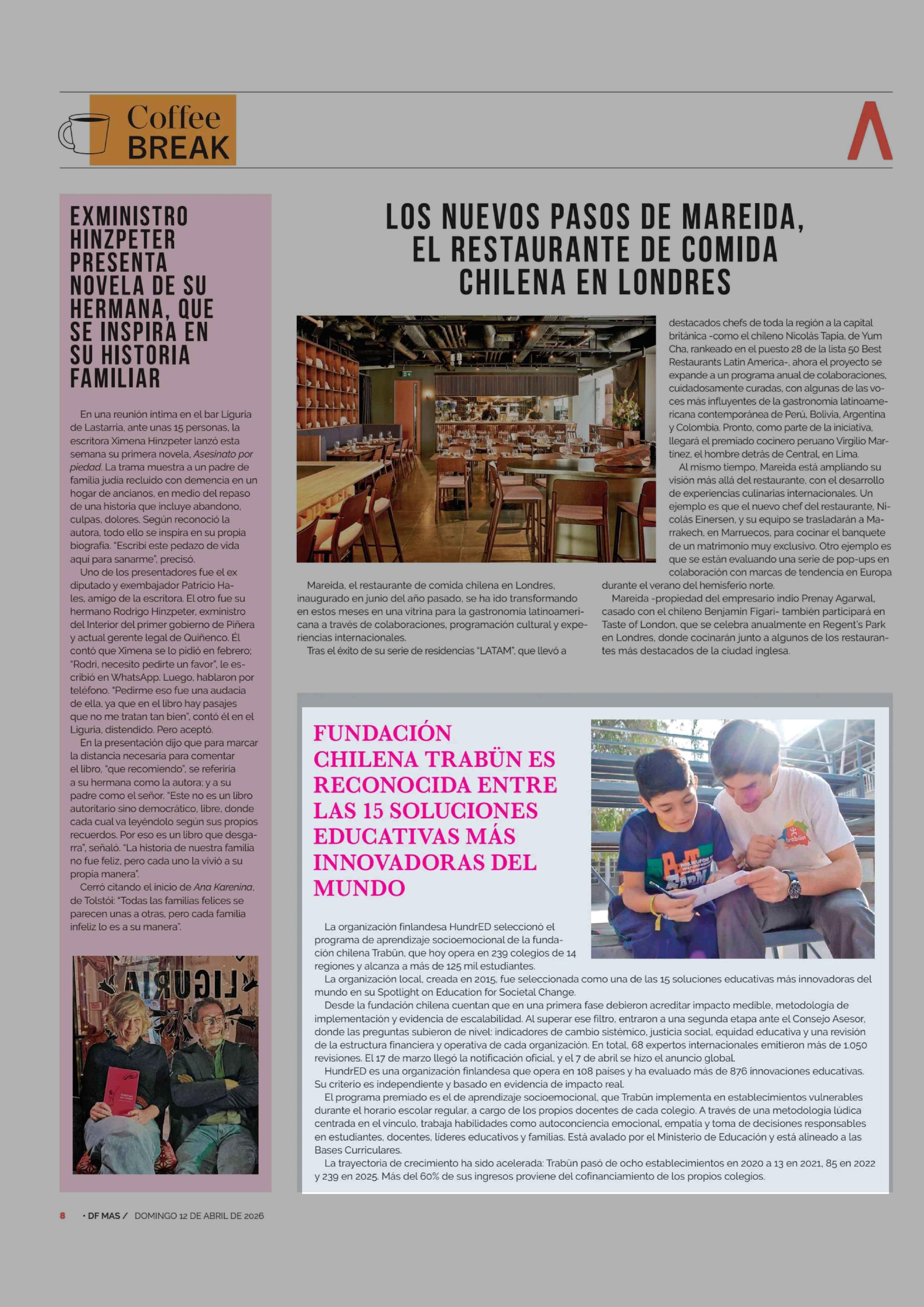 FUNDACIÓN CHILENA TRABÜN ES RECONOCIDA ENTRE LAS 15 SOLUCIONES EDUCATIVAS MÁS INNOVADORAS DEL MUNDO 12-04-2026 Diario Financiero |