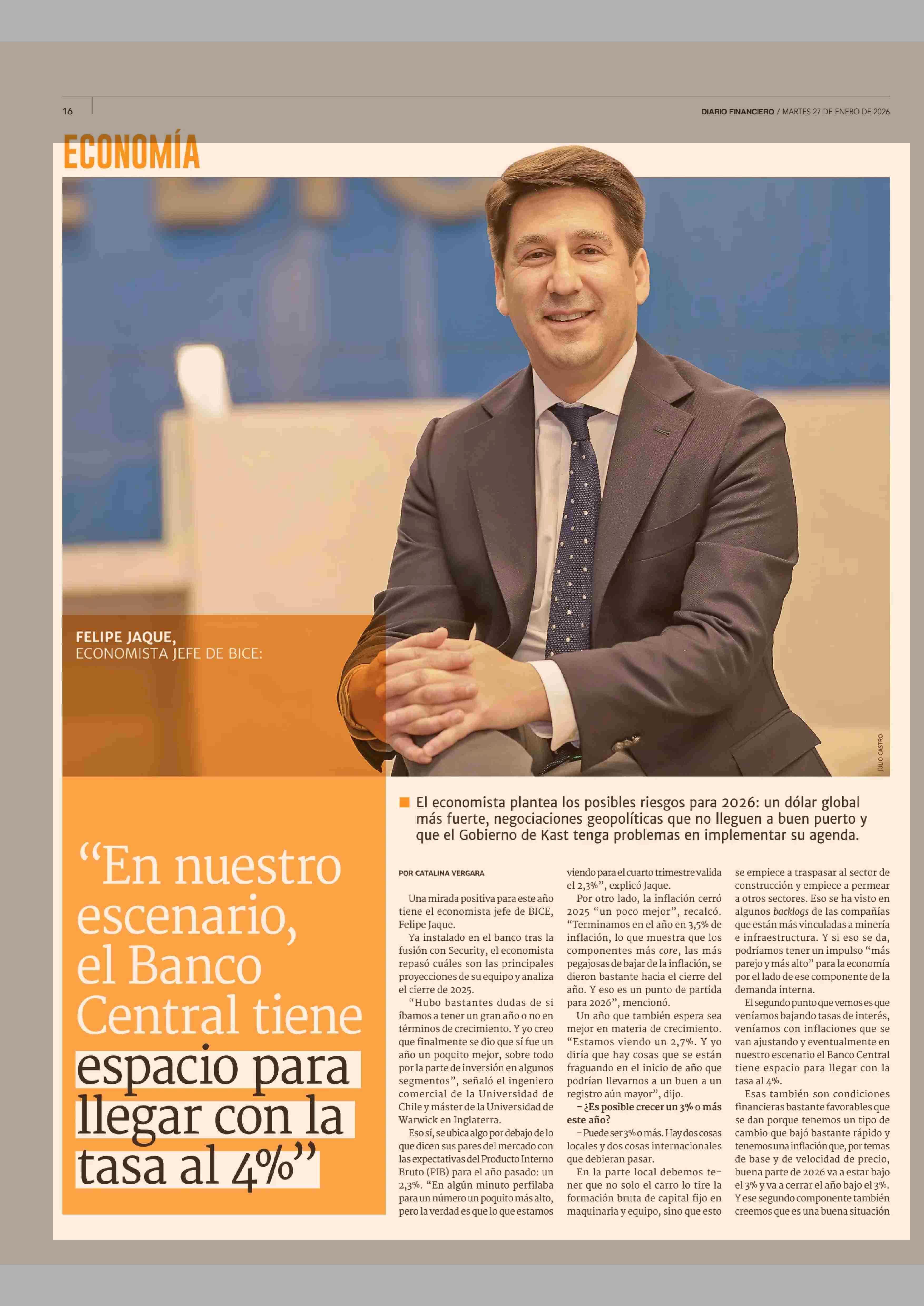 "En nuestro escenario, el Banco Central tiene espacio para llegar con la tasa al 4%" 27-01-2026 Diario Financiero |