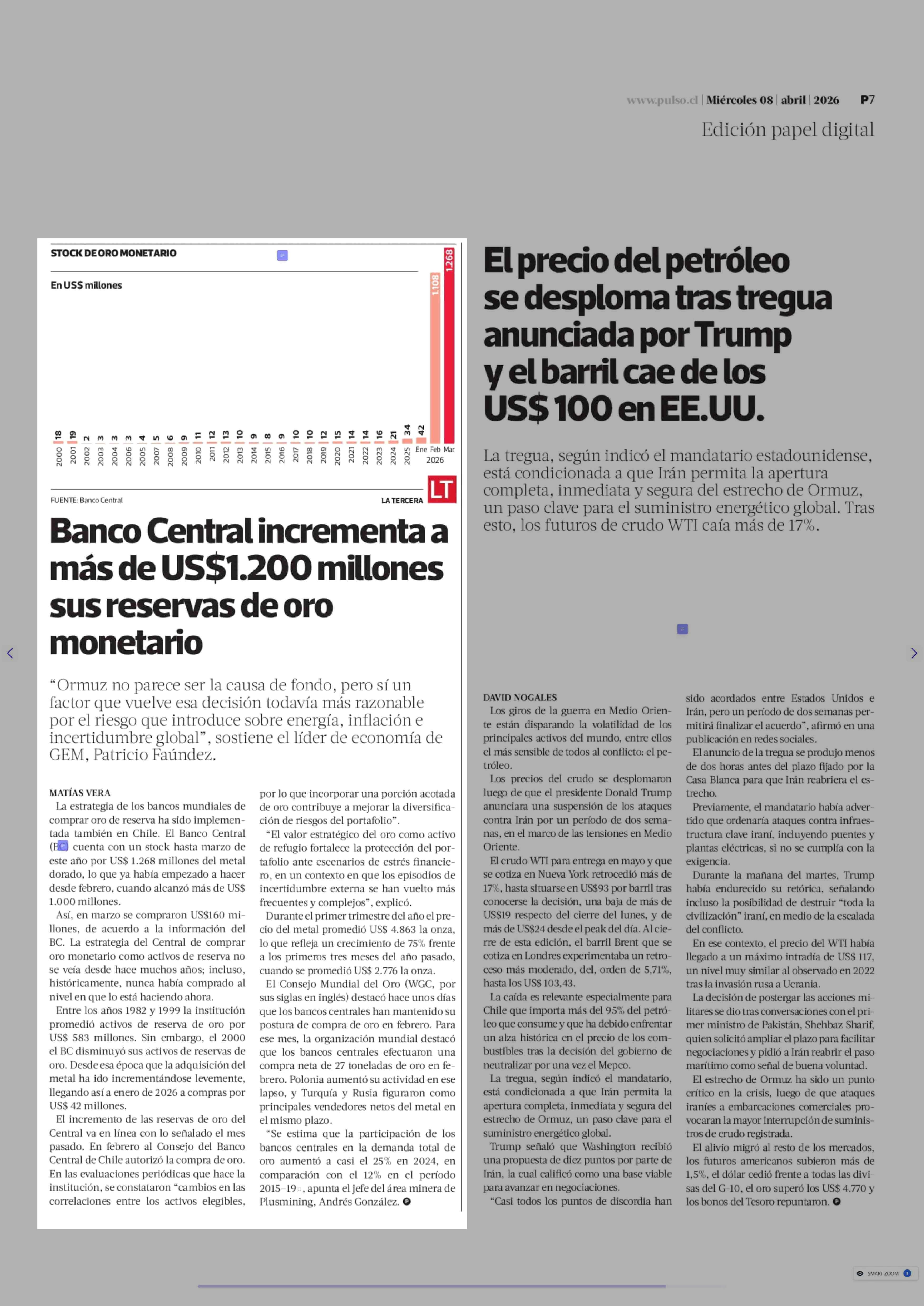 Banco Central incrementa a más de US$1.200 millones sus reservas de oro monetario 08-04-2026 La Tercera |