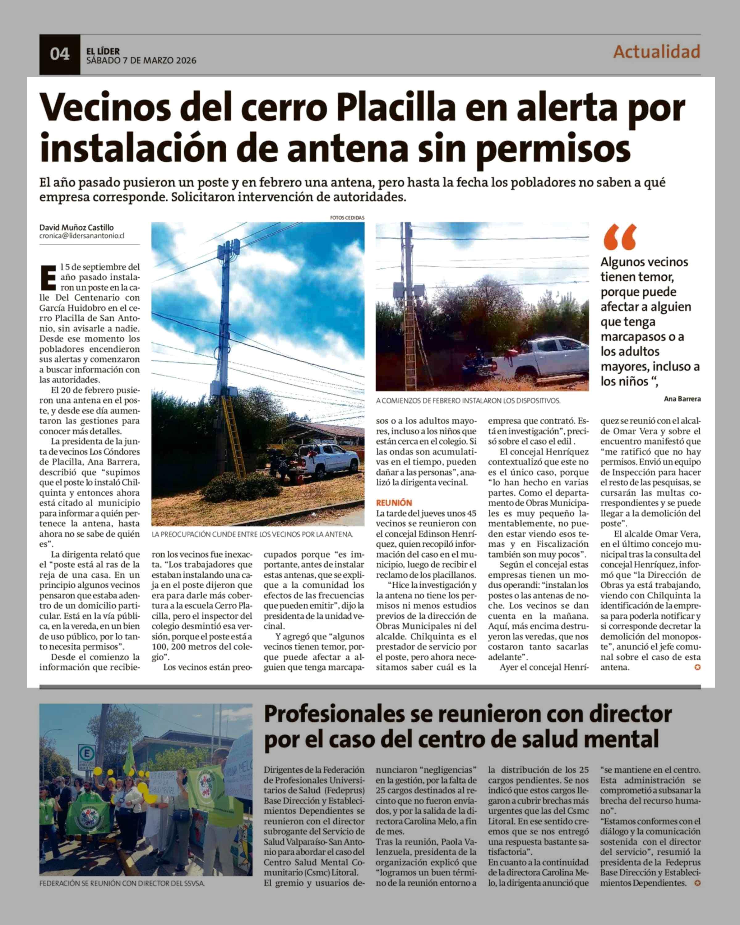 Título: Vecinos del cerro Placilla en alerta por instalación de antena sin permisos