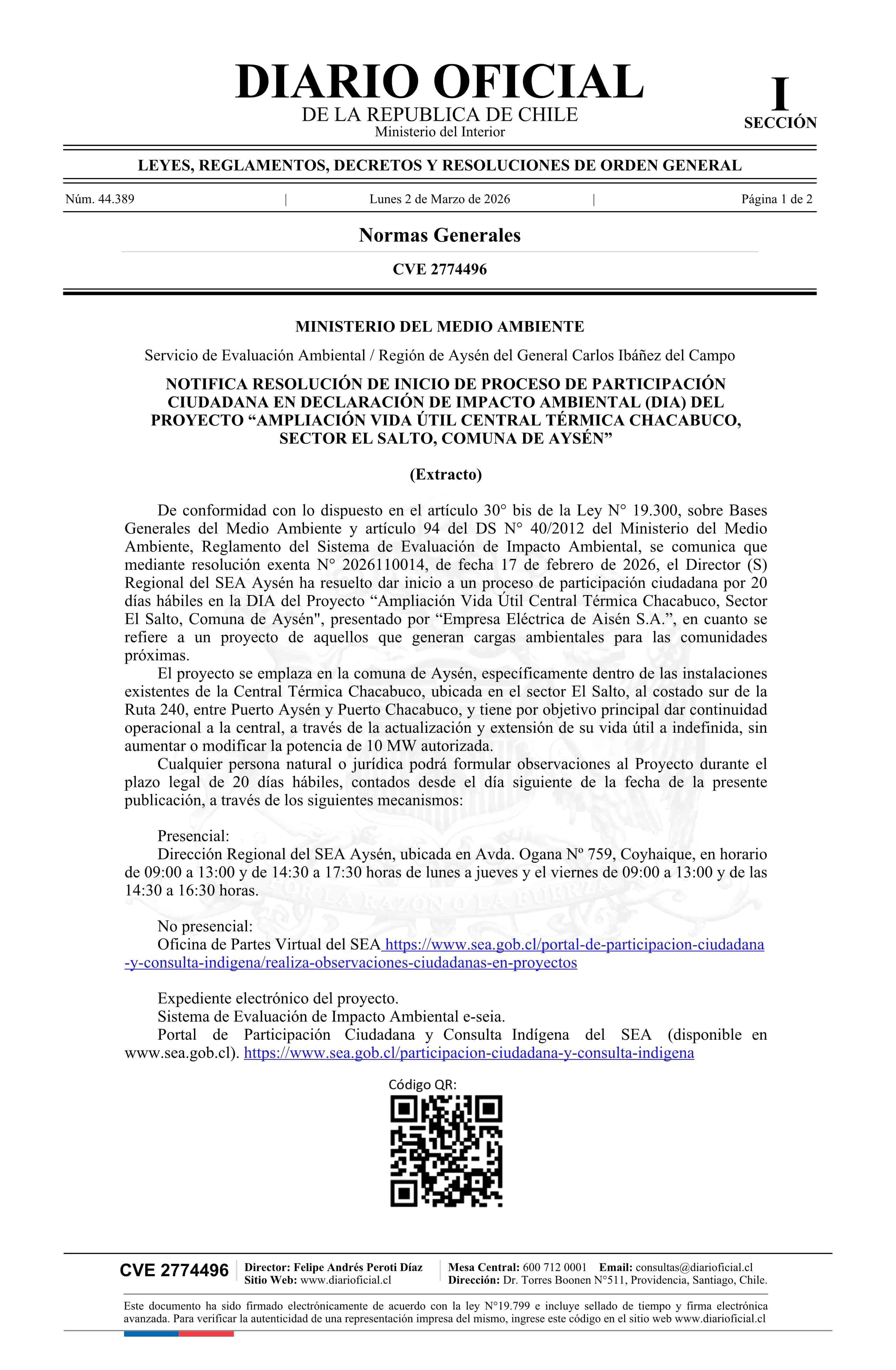 Título: Extracto de resolución exenta número 2026110014, de 2026.- Inicia proceso de participación ciudadana en Declaración de Impacto Ambiental del proyecto Ampliación Vida Útil Central Térmica Chacabuco, sector El Salto, comuna de Aysén
