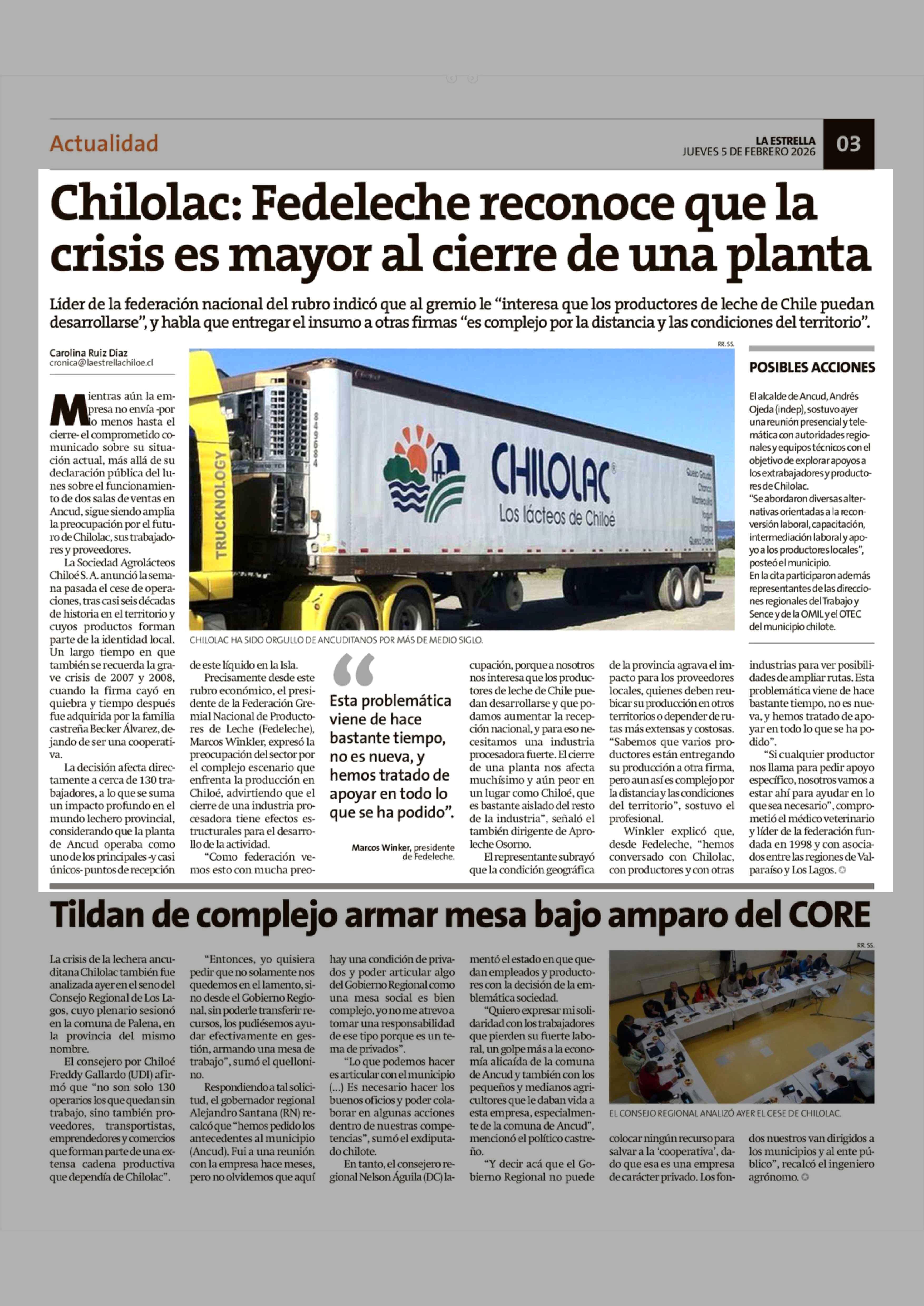 Chilolac: Fedeleche reconoce que la crisis es mayor al cierre de una planta 05-02-2026 La Estrella de Chiloé |