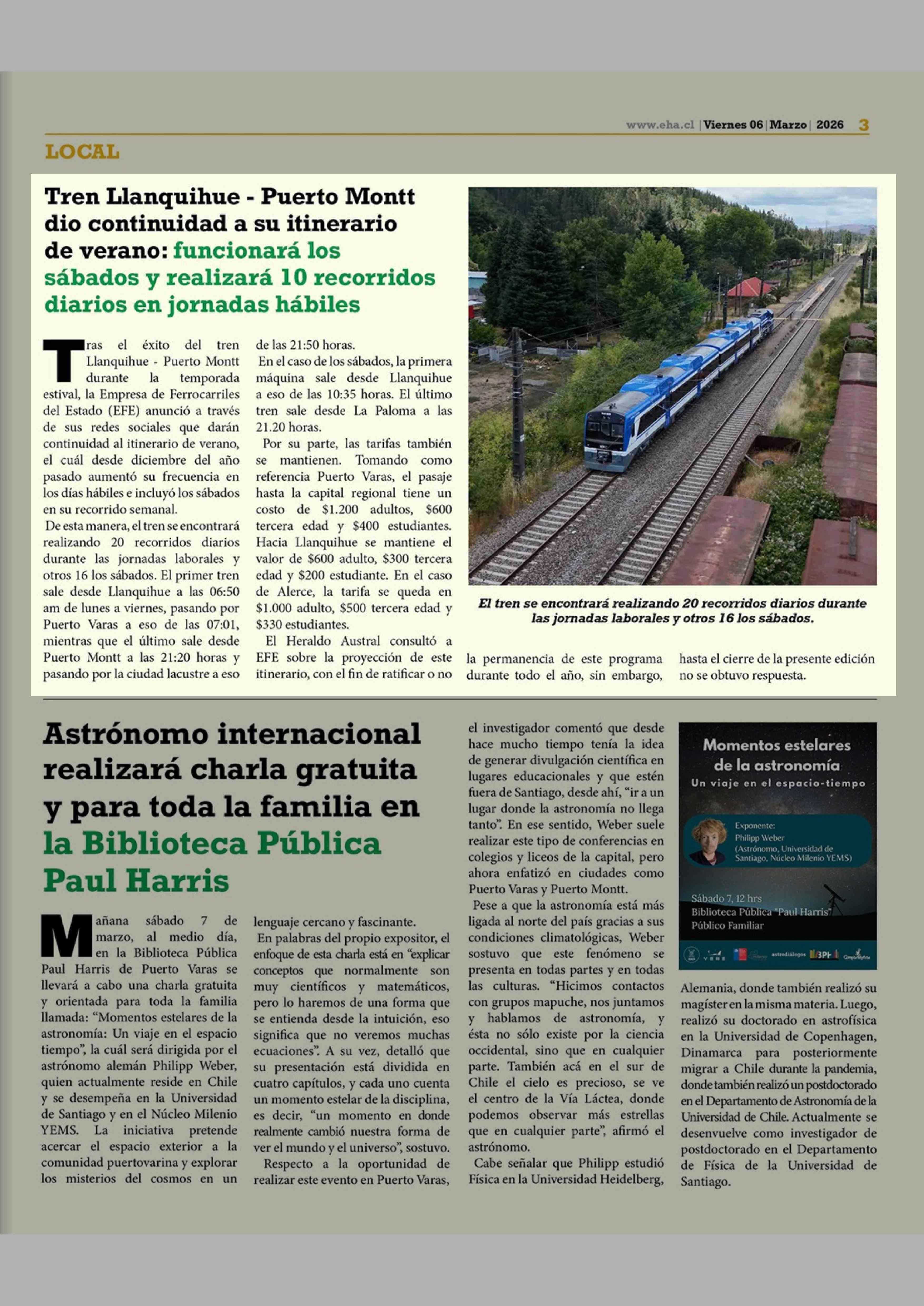Tren Llanquihue - Puerto Montt dio continuidad a su itinerario de verano: funcionará los sábados y realizará 10 recorridos diarios en jornadas hábiles 06-03-2026 El Heraldo Austral |