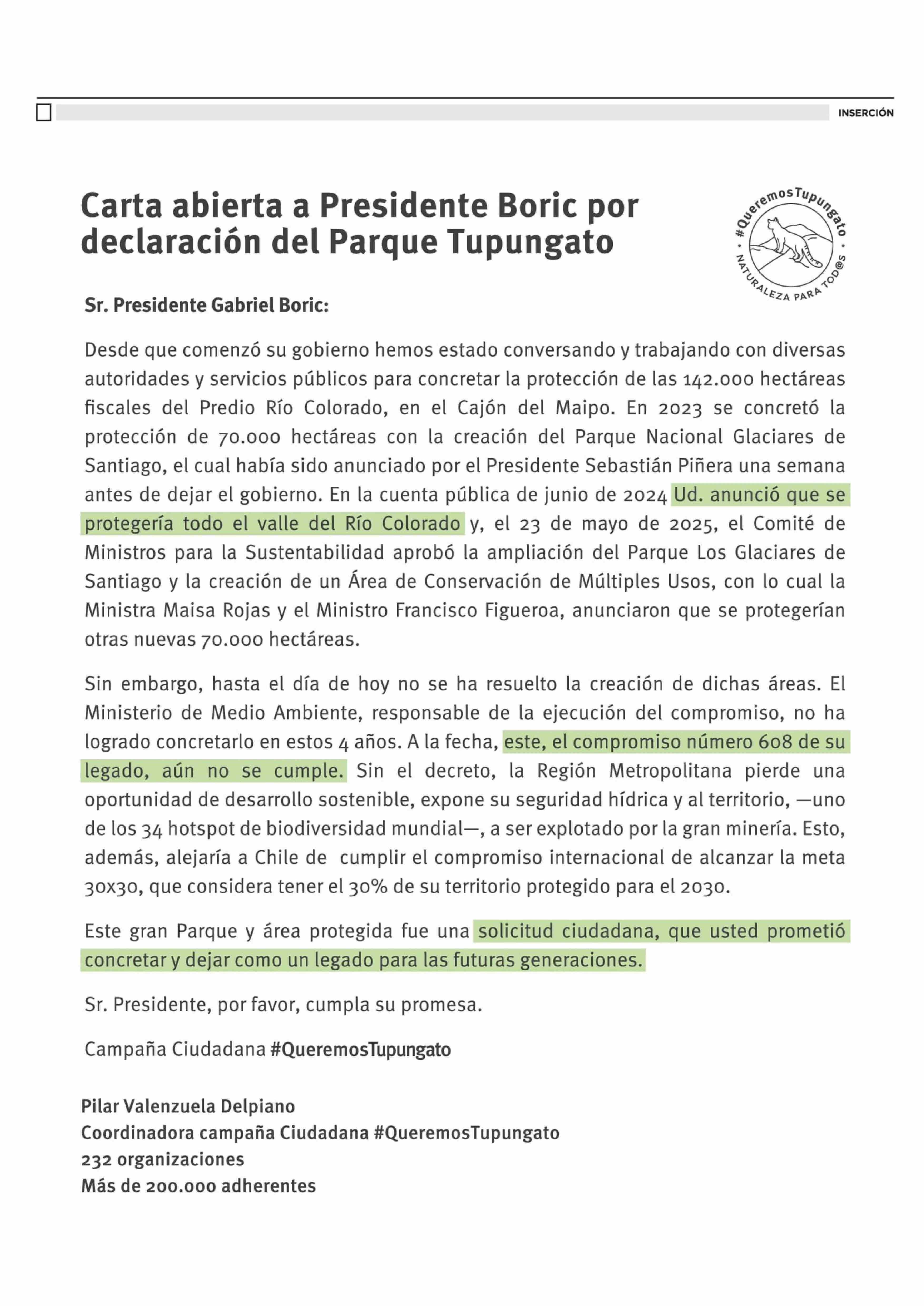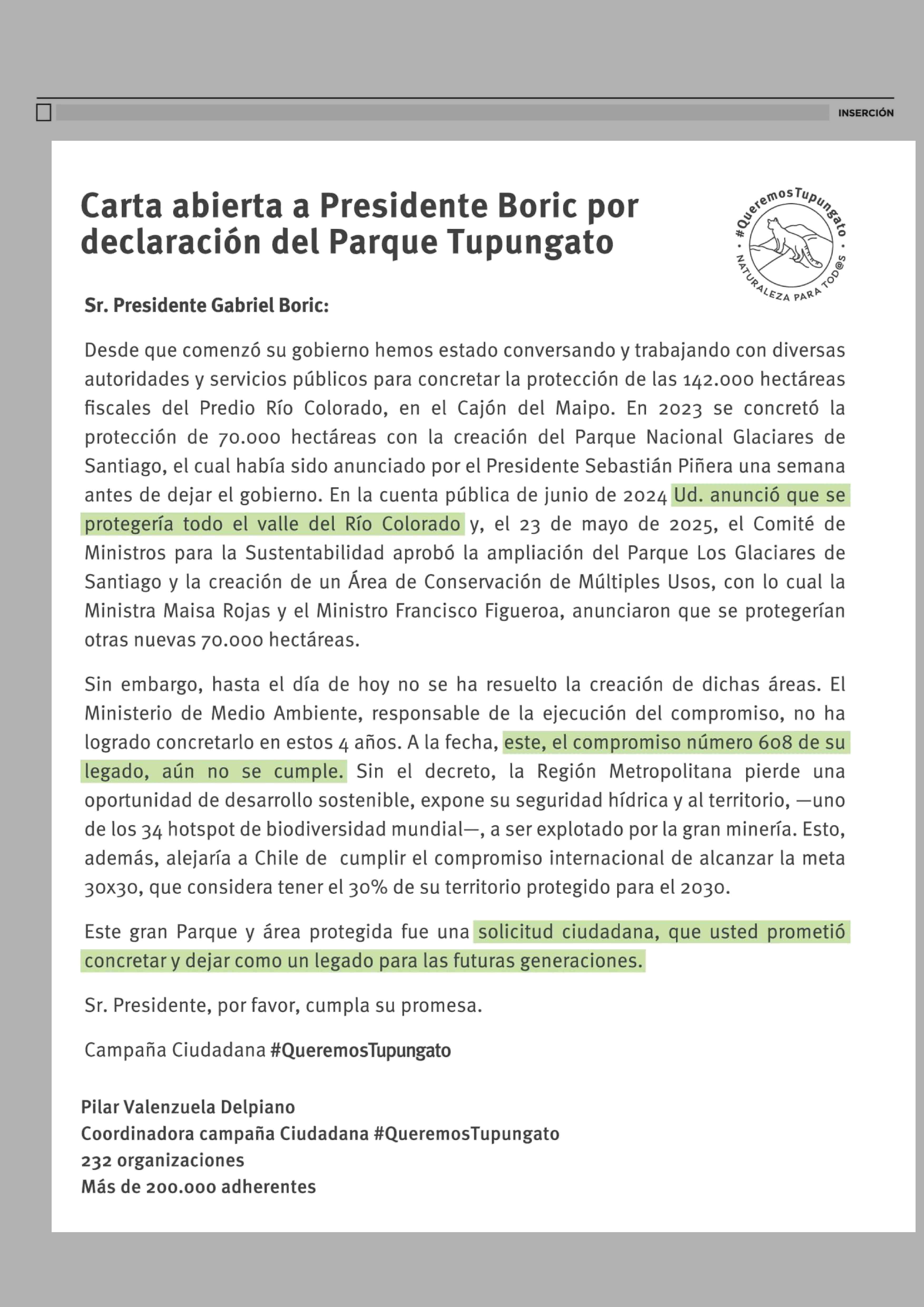 Título: Extractos: Carta abierta a Presidente Boric por declaración del Parque Tupungato