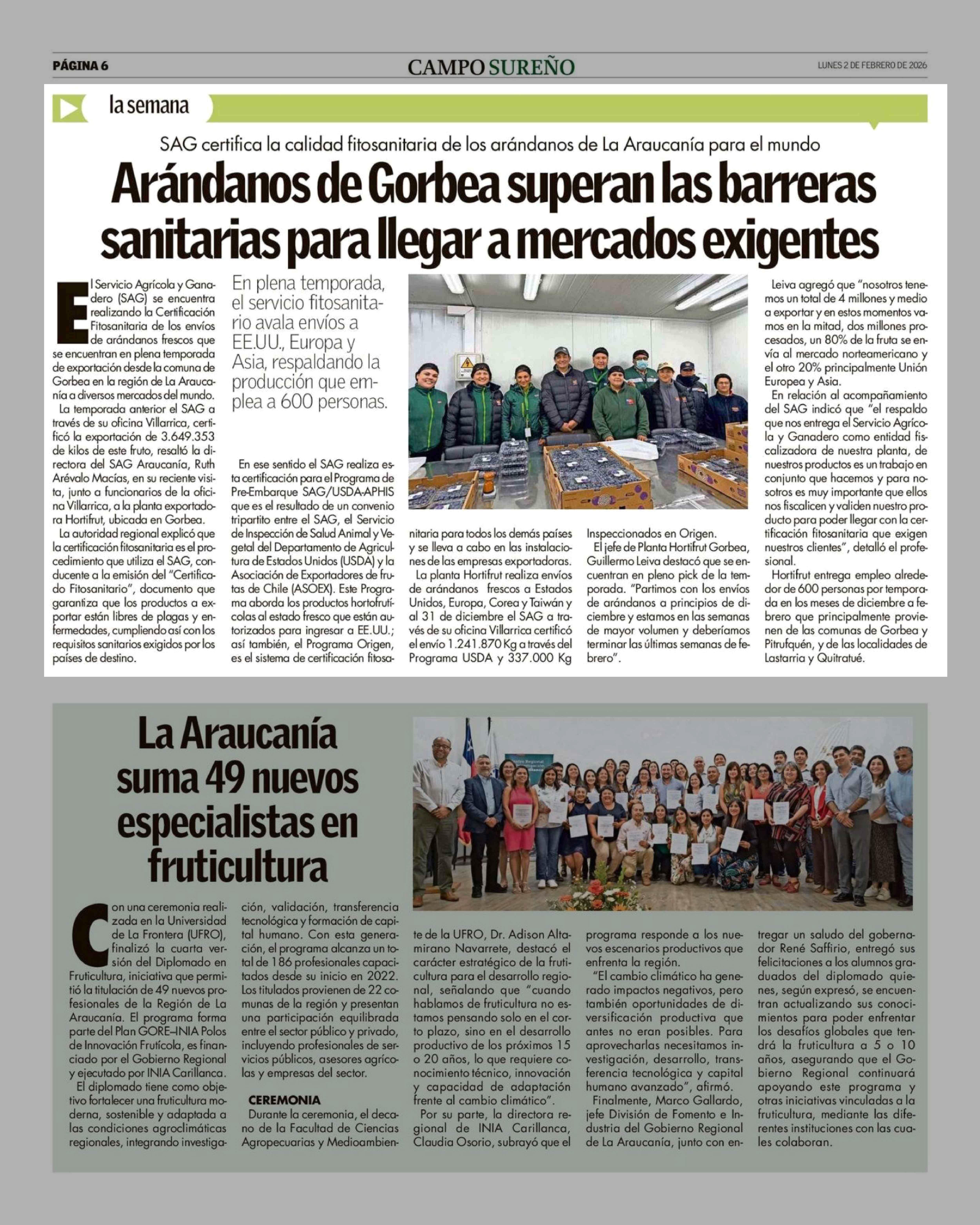 Arándanos de Gorbea superan las barreras sanitarias para llegar a mercados exigentes 02-02-2026 Campo Sureño - Regiones IX, X y XIV |