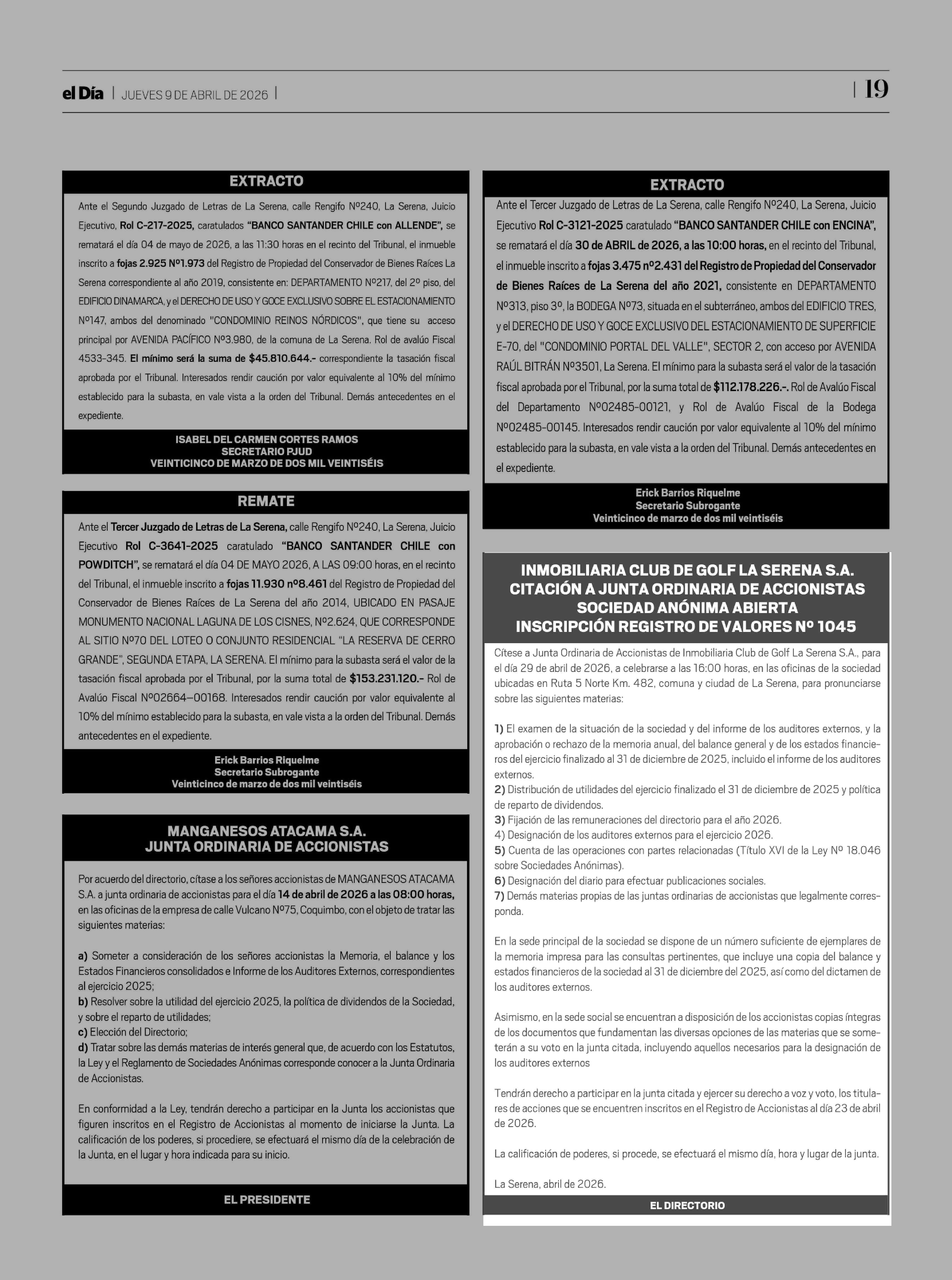 Extractos: INMOBILIARIA CLUB DE GOLF LA SERENA S.A. 09-04-2026 El Día |