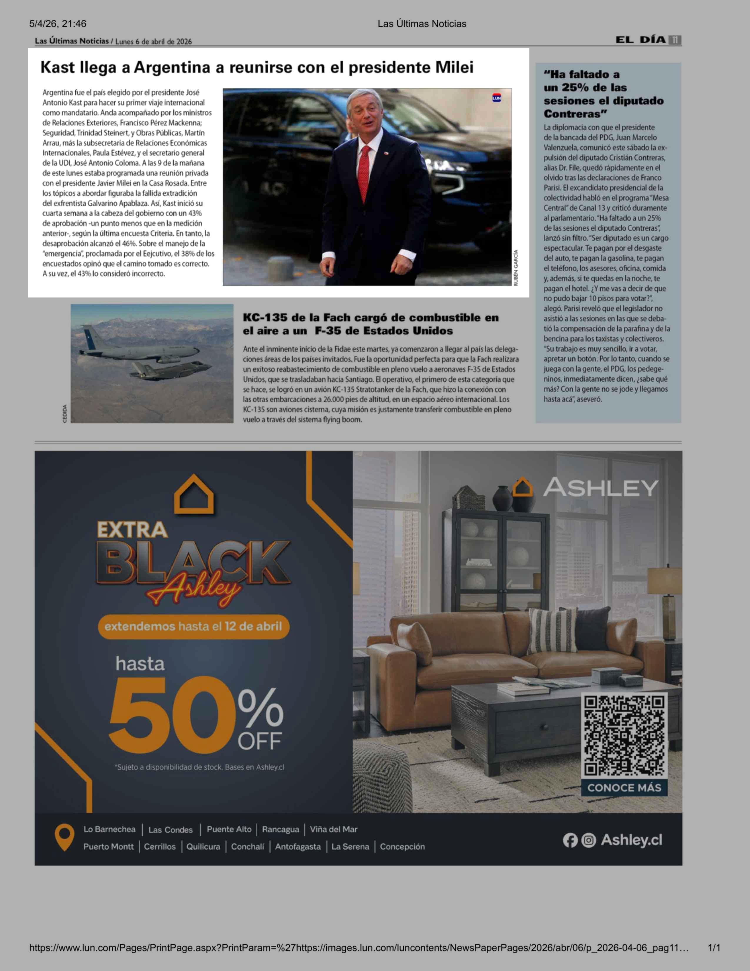 Kast llega a Argentina a reunirse con el presidente Milei 06-04-2026 Las Últimas Noticias |