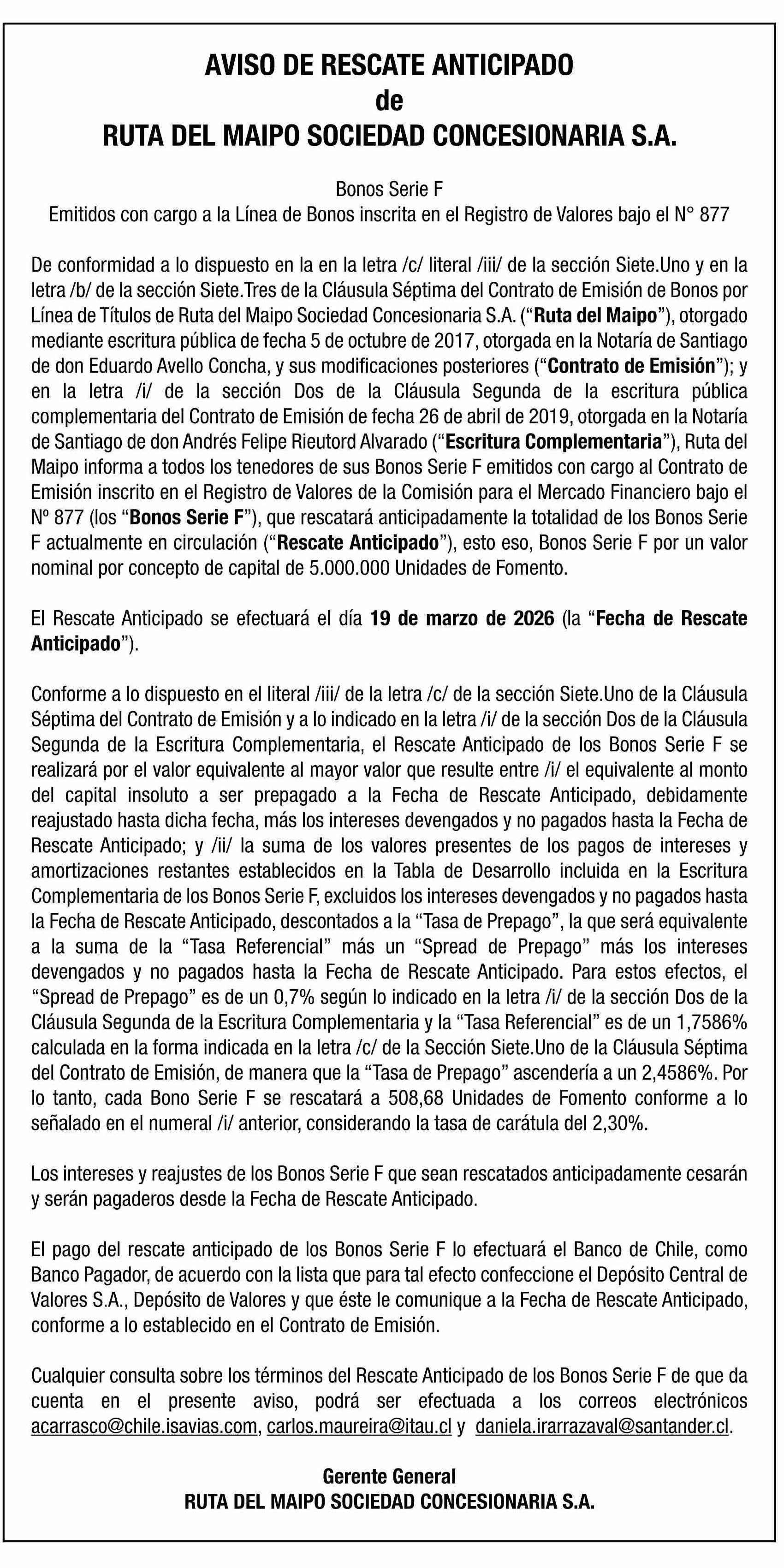EXTRACTOS: AVISO DE RESCATE ANTICIPADO de RUTA DEL MAIPO SOCIEDAD CONCESIONARIA S.A.