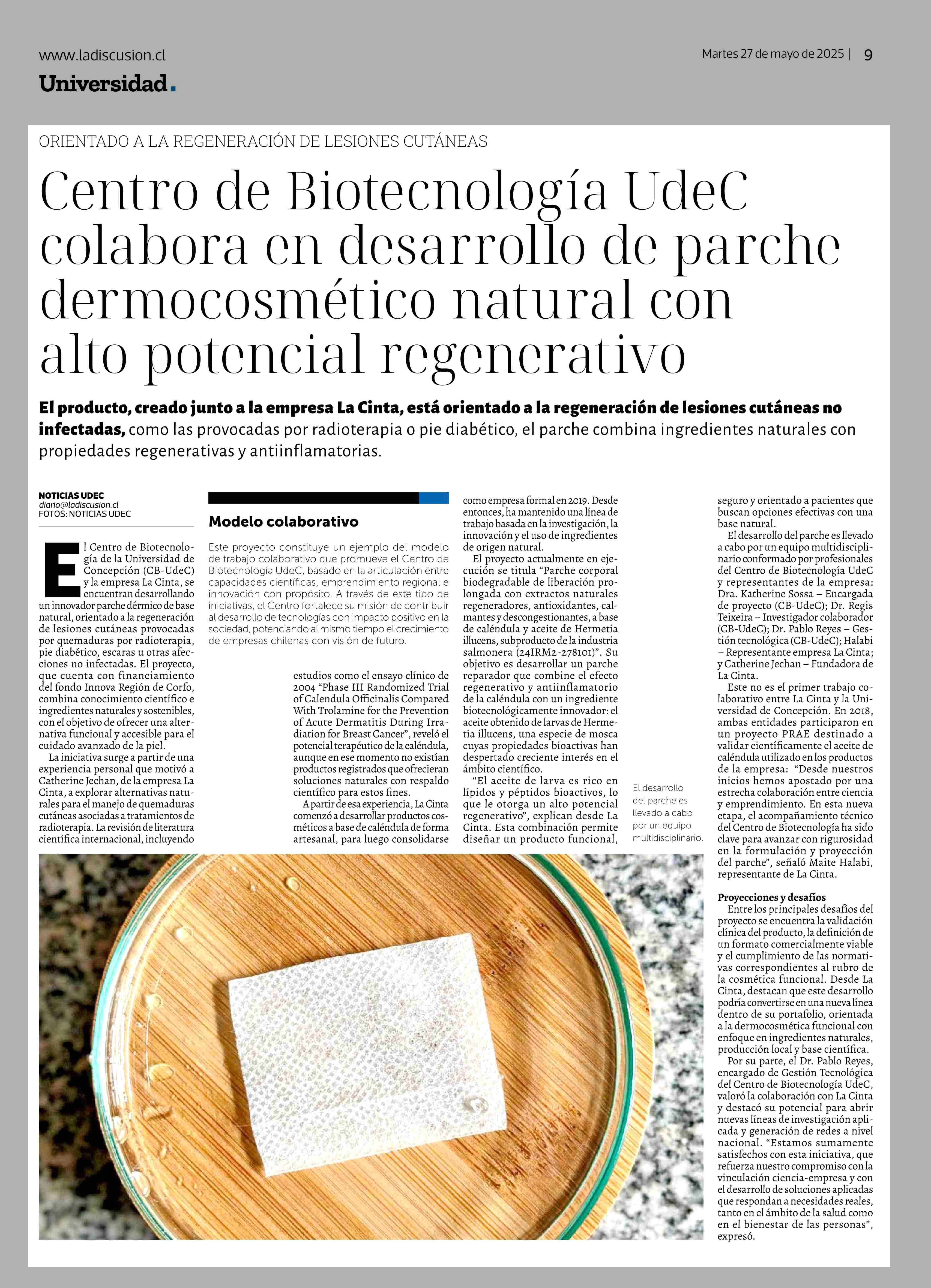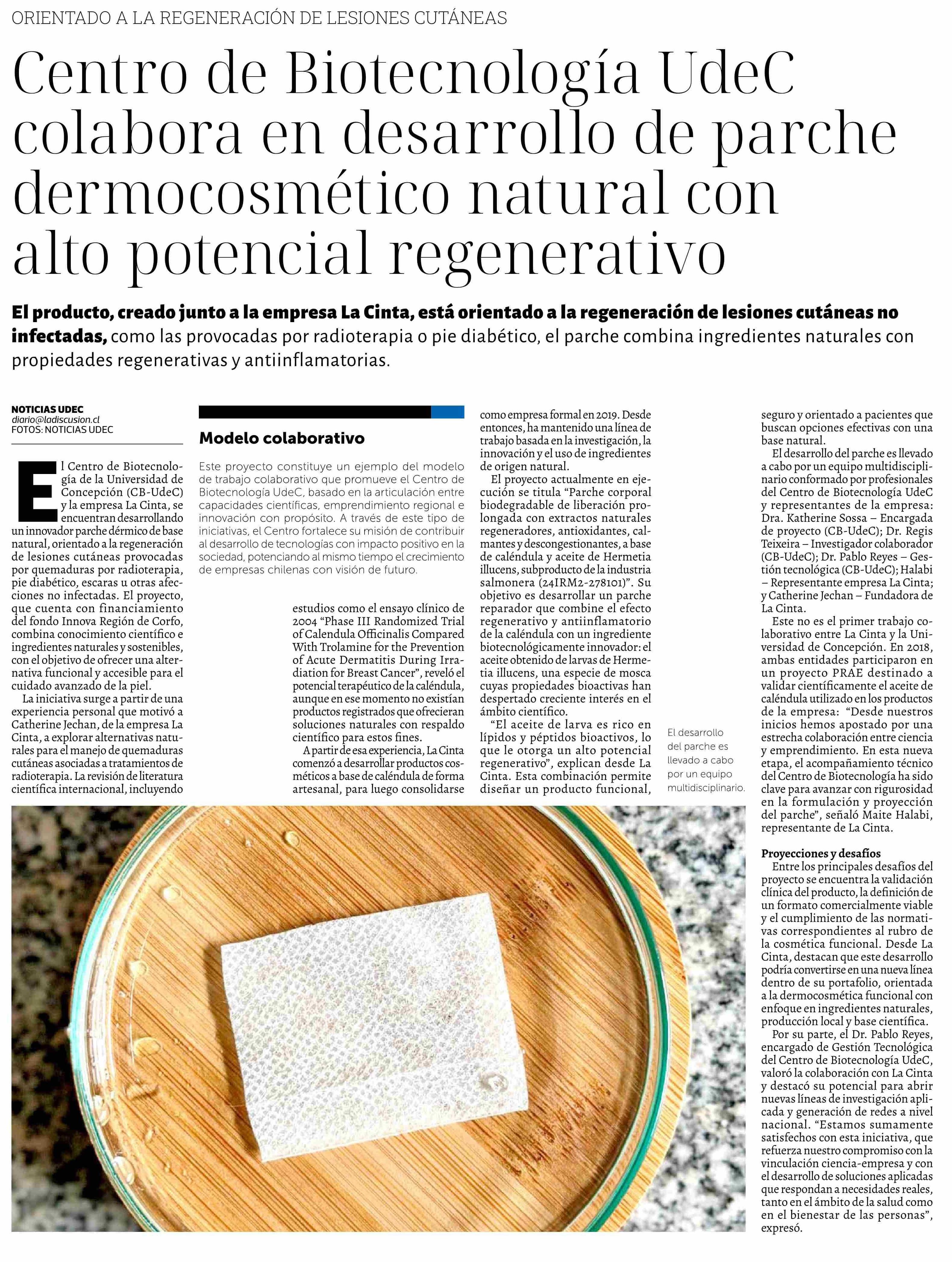 Título: Centro de Biotecnología UdeC colabora en desarrollo de parche dermocosmético natural con alto potencial regenerativo