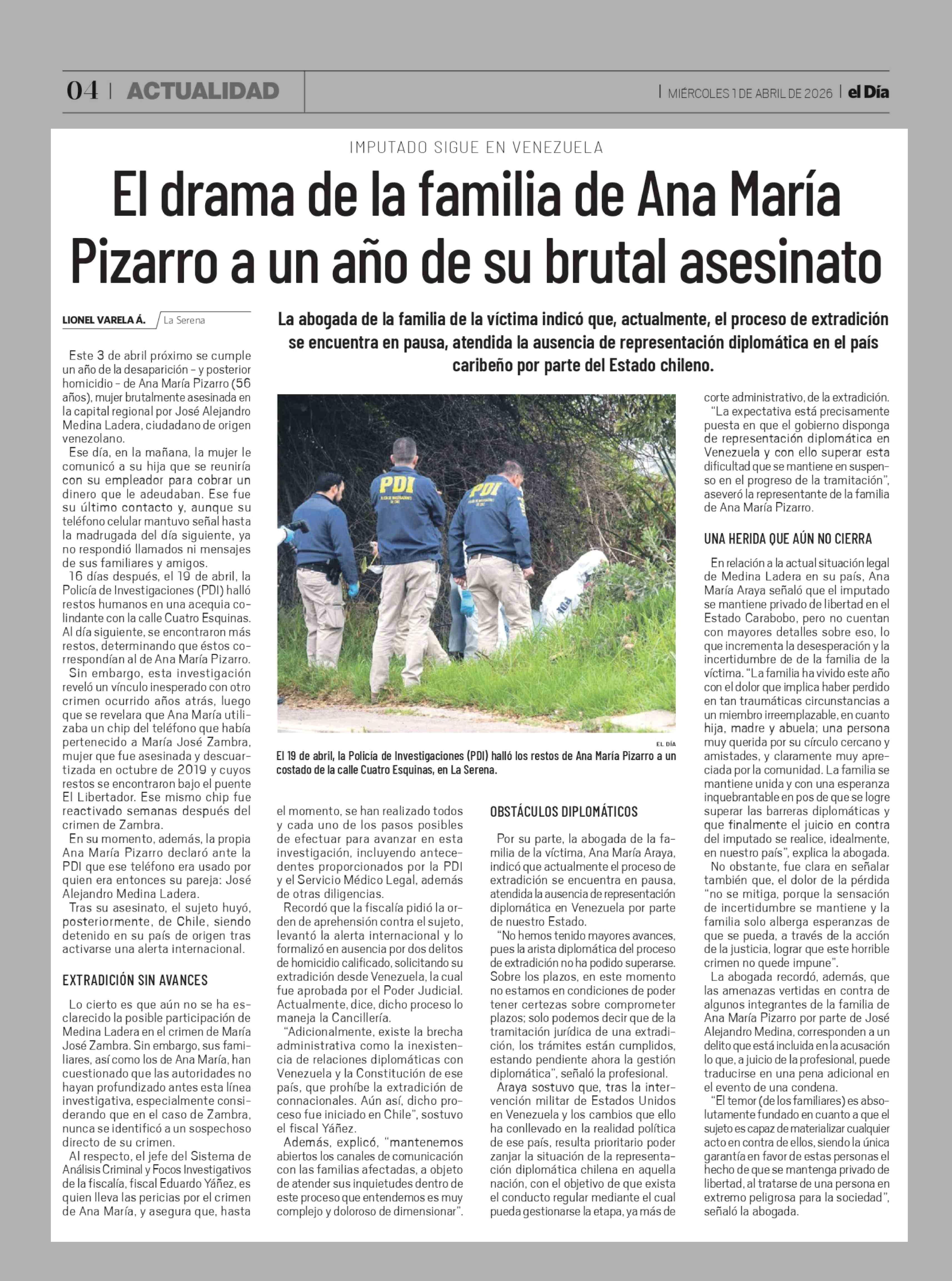El drama de la familia de Ana María Pizarro a un año de su brutal asesinato 01-04-2026 El Día |