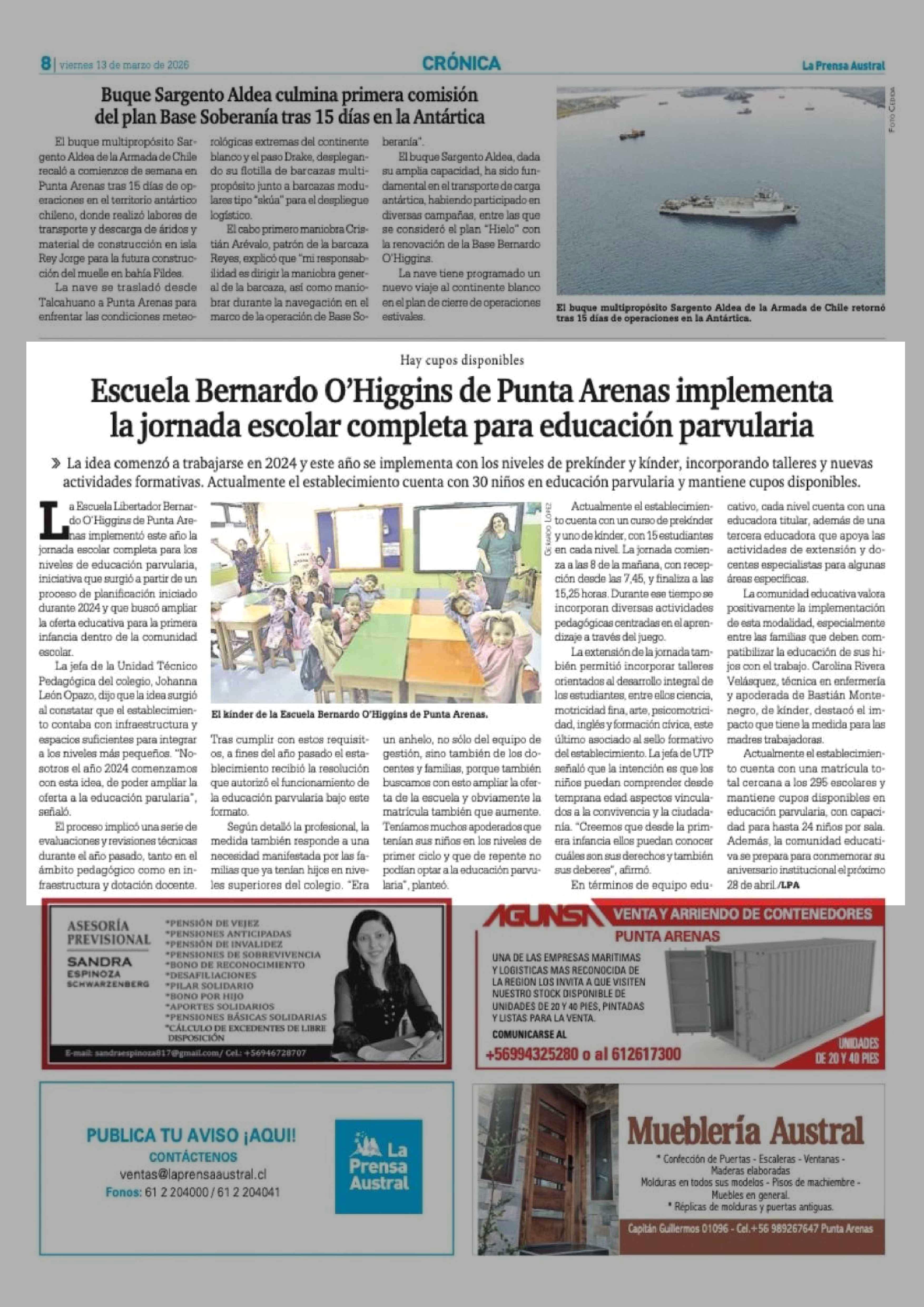 Escuela Bernardo O'Higgins de Punta Arenas implementa la jornada escolar completa para educación parvularia 13-03-2026 La Prensa Austral |