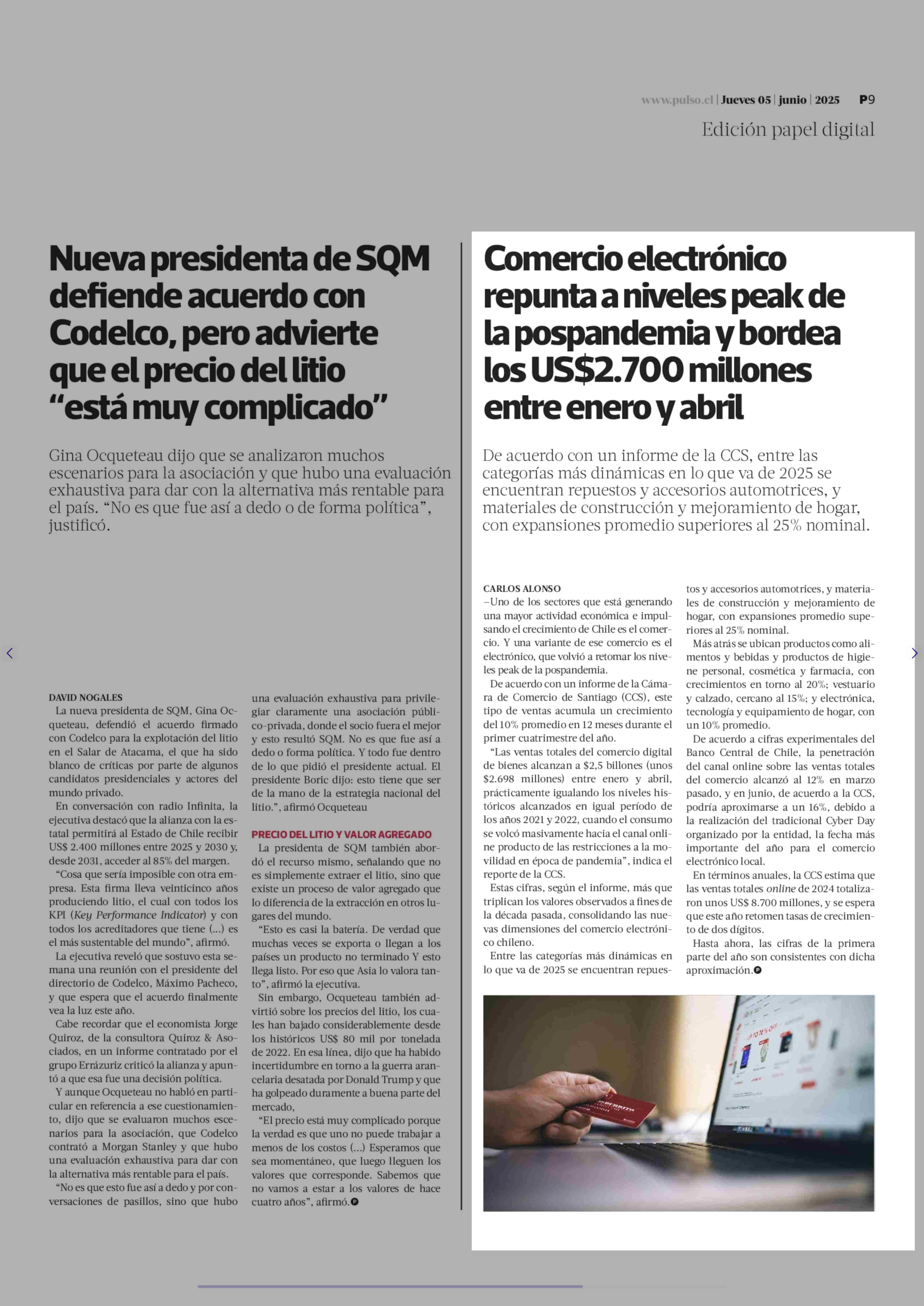 Comercio electrónico repunta a niveles peak de la pospandemia y bordea los US$2.700 millones entre enero y abril 05-06-2025 La Tercera |