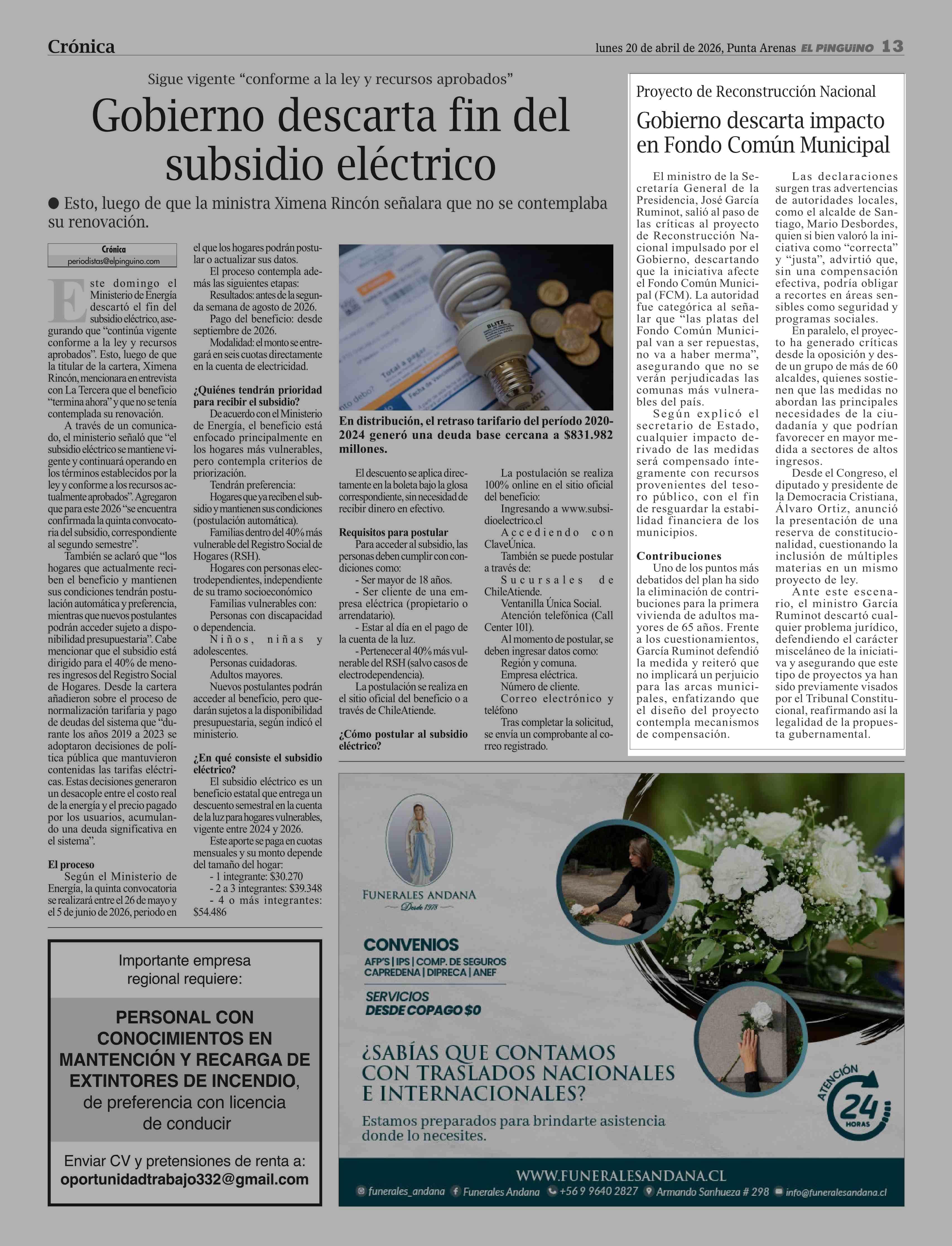 Gobierno descarta impacto en Fondo Común Municipal 20-04-2026 El Pingüino |