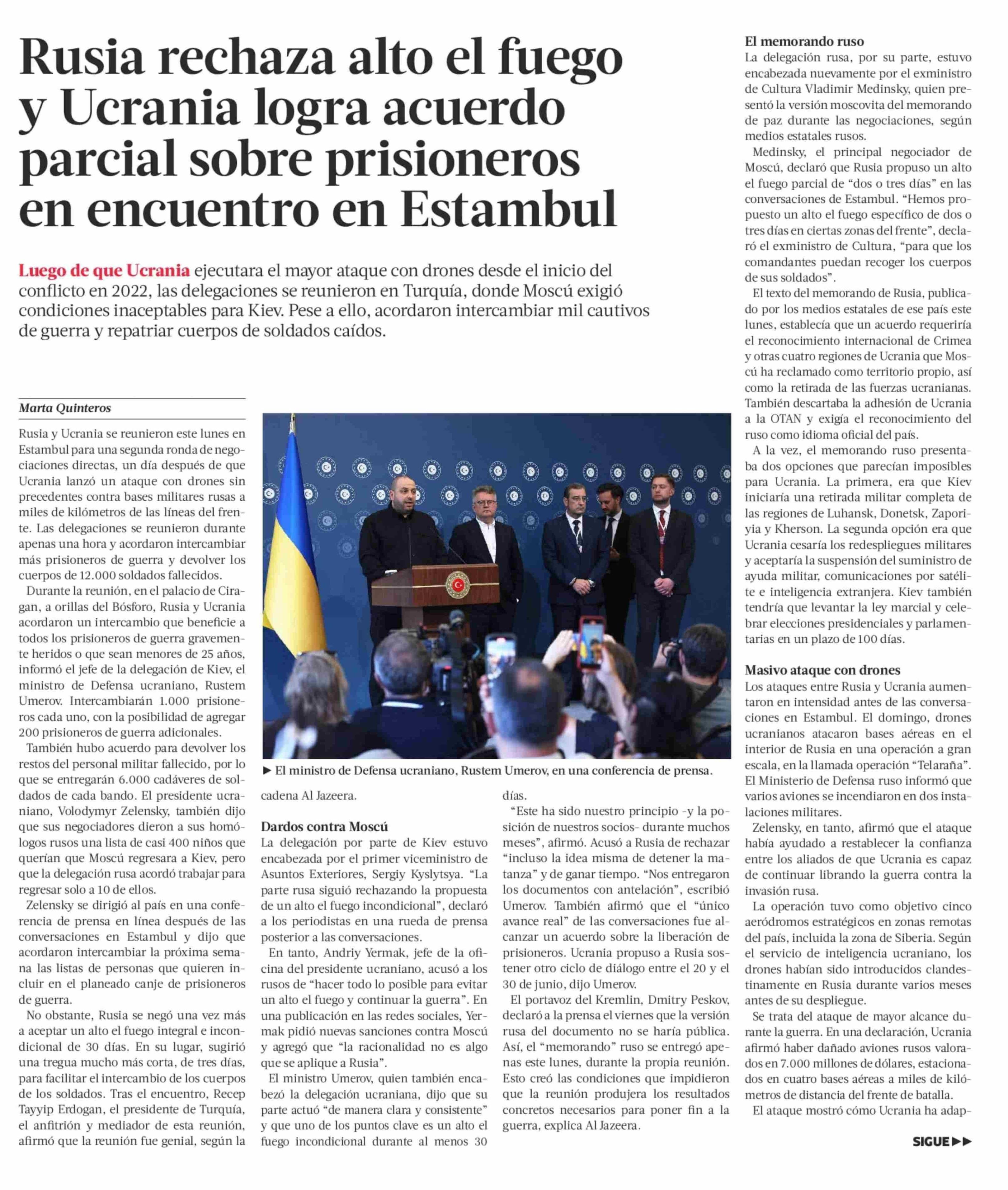 Título: Rusia rechaza alto el fuego y Ucrania logra acuerdo parcial sobre prisioneros en encuentro en Estambul