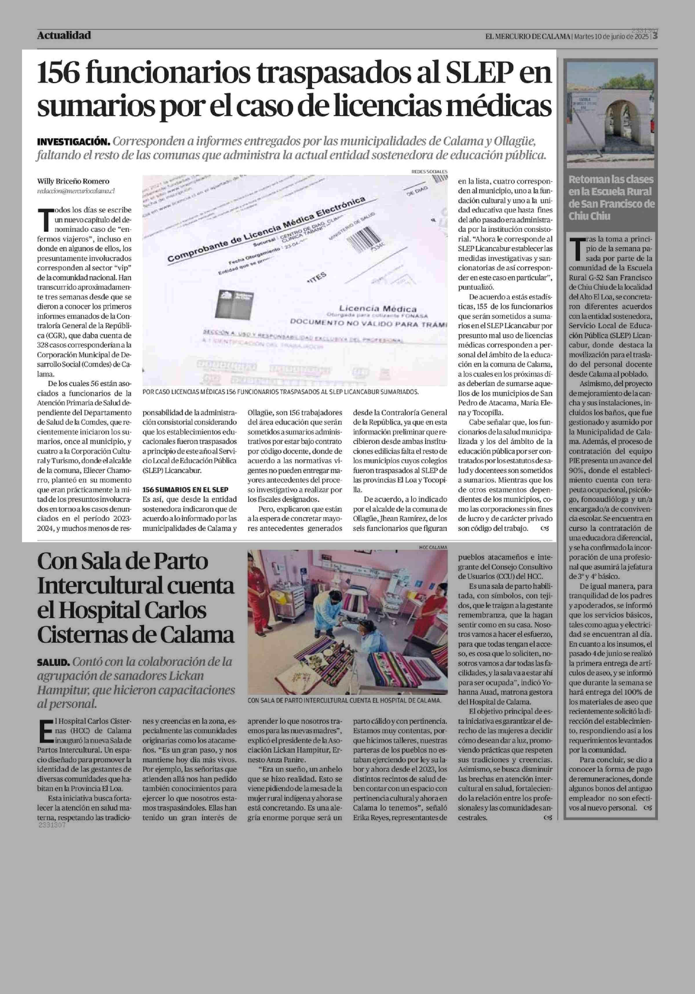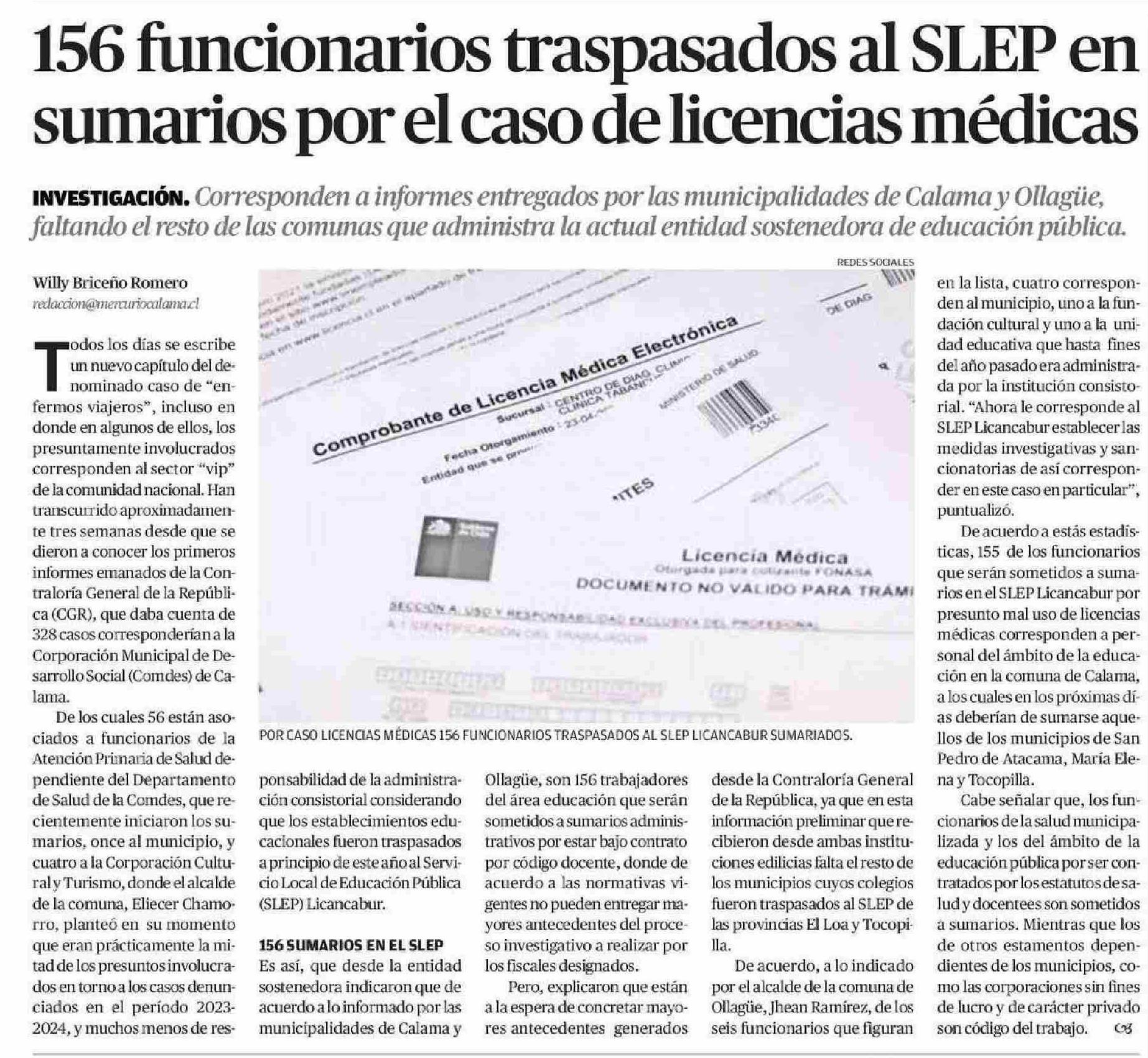 156 funcionarios traspasados al SLEP en sumarios por el caso de licencias médicas 10-06-2025 El Mercurio de Calama |
