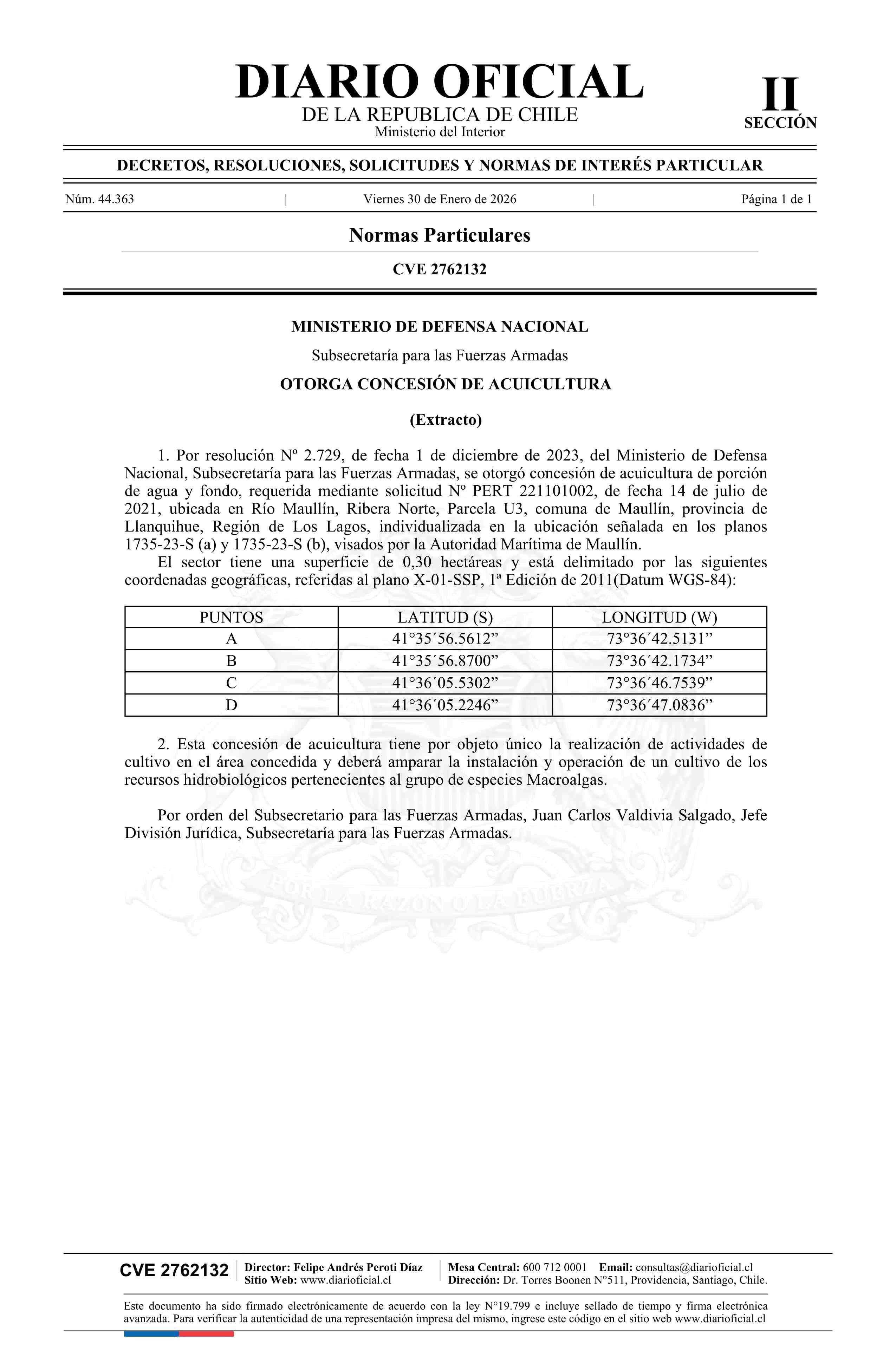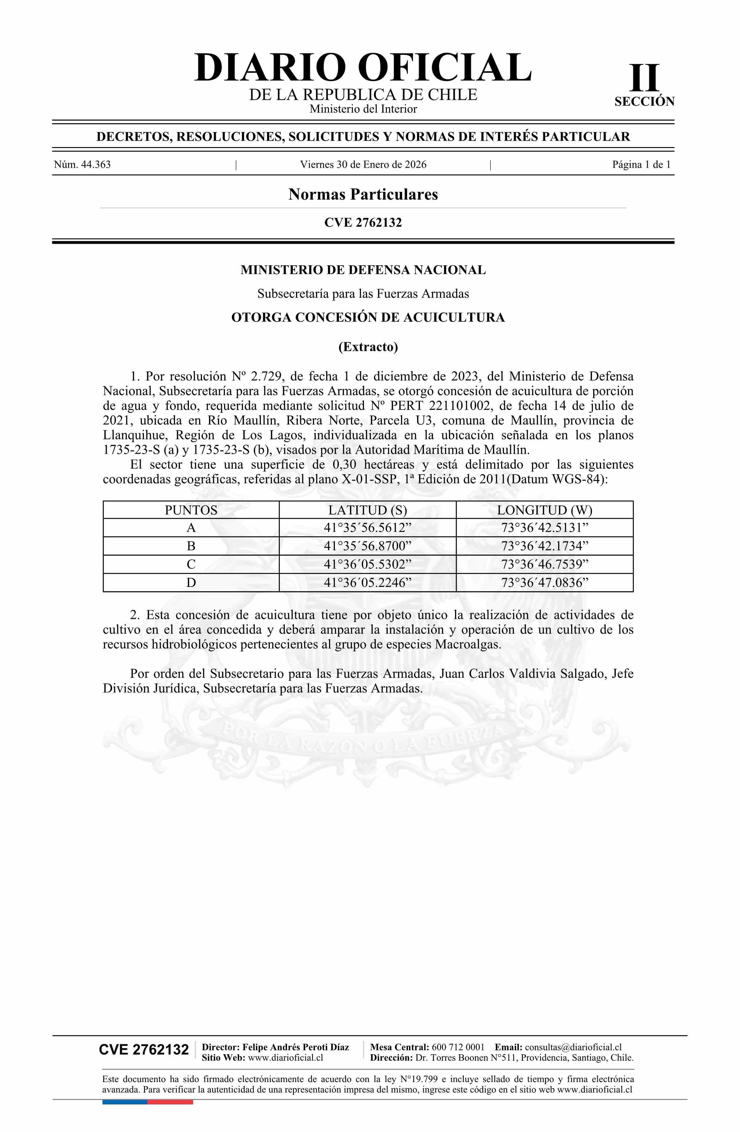 Extracto de resolución número 2.729, de 2023.- Otorga concesión de acuicultura
