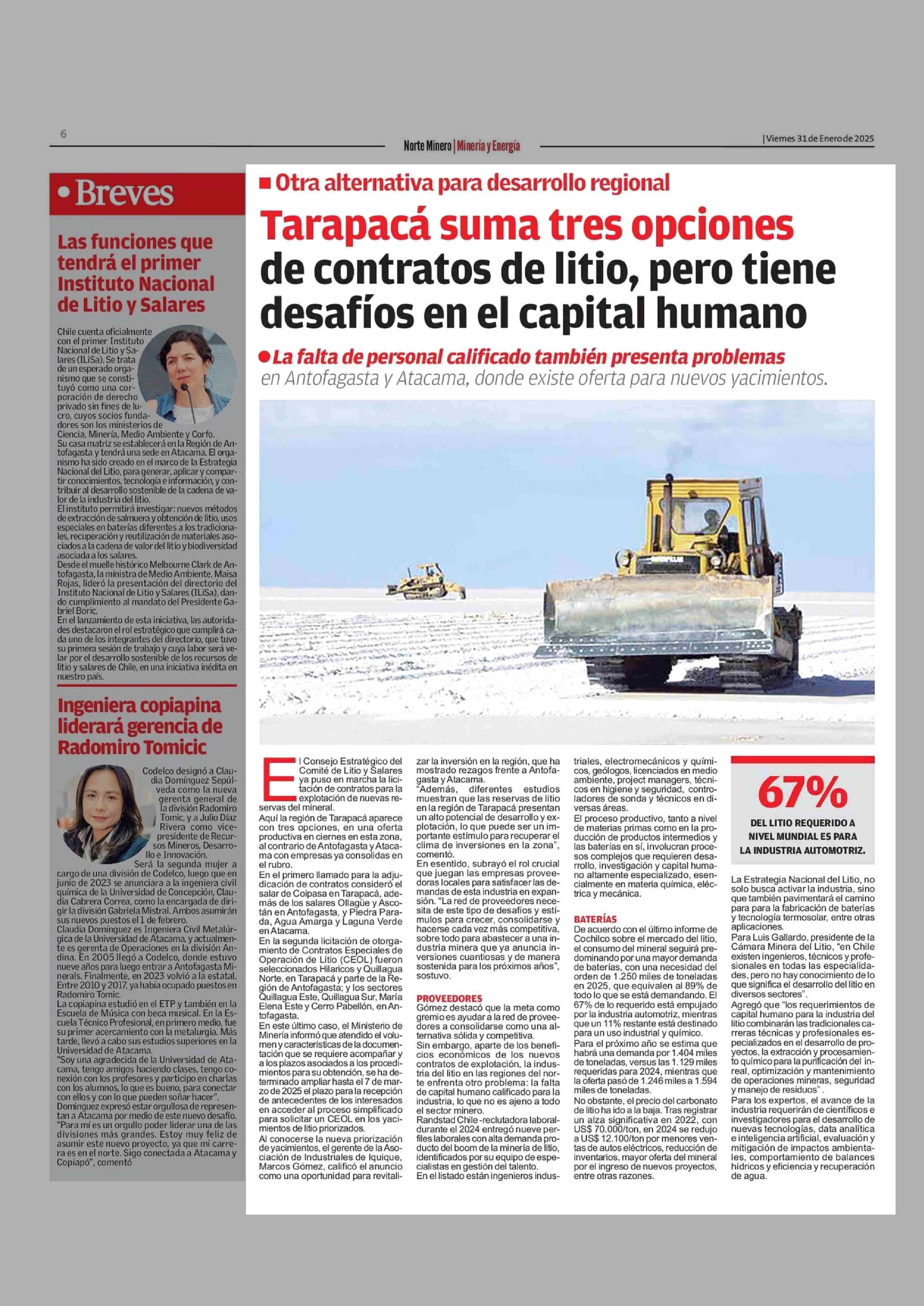 Tarapacá suma tres opciones de contratos de litio, pero tiene desafíos en el capital humano 31-01-2025 Revista Norte Minero - Regiones I, II y III |