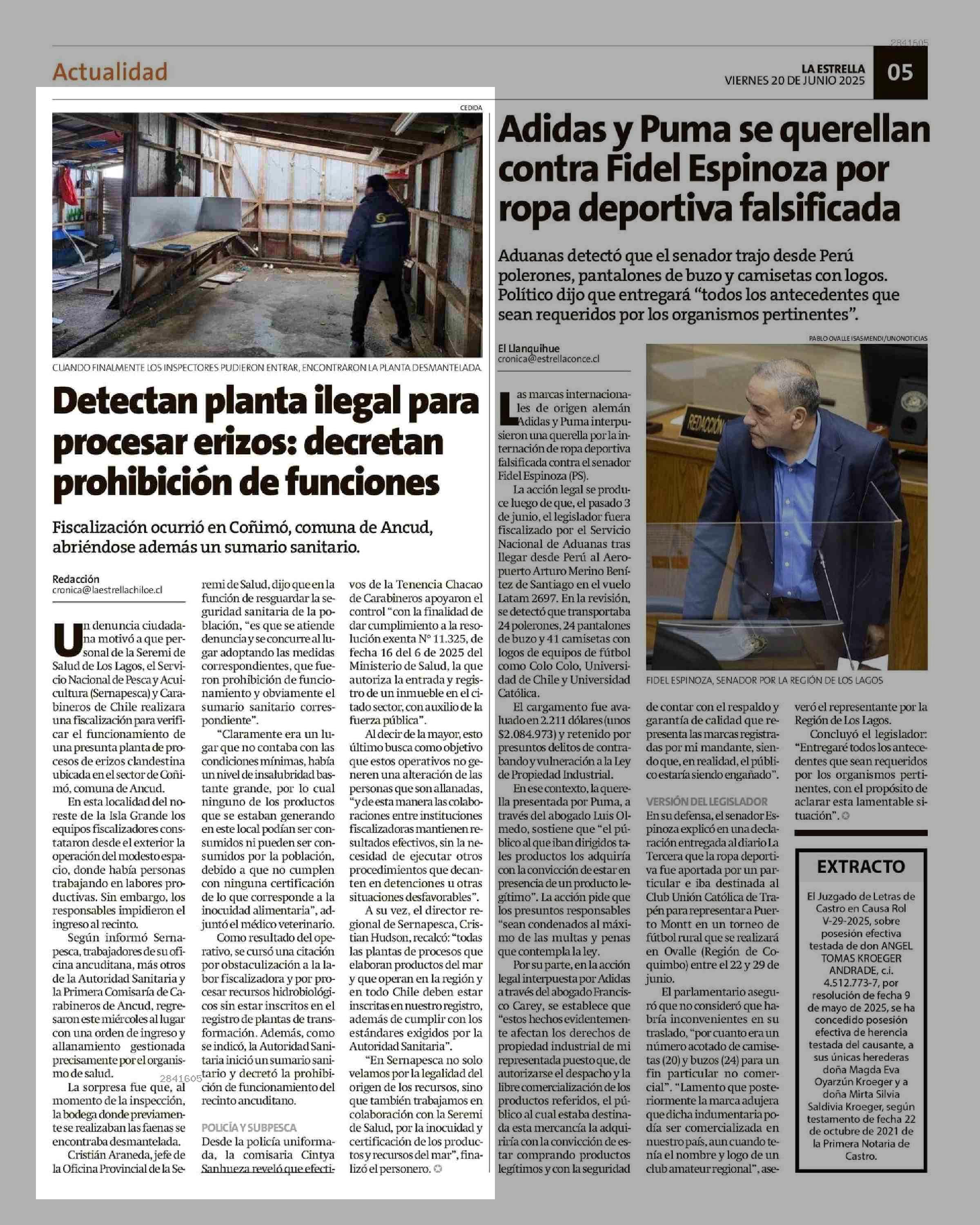 Detectan planta ilegal para procesar erizos: decretan prohibición de funciones 20-06-2025 La Estrella de Chiloé |