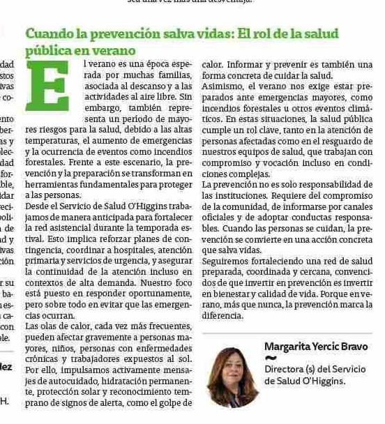 Título: Columnas de Opinión: Cuando la prevención salva vidas: El rol de la salud pública en verano I verano es una época espe- calor. Informar y prevenir es también una rada por muchas familias, forma concreta de cuidar la salud. asociada al descanso y a las actividades al aire libre. Sin embargo, tambien