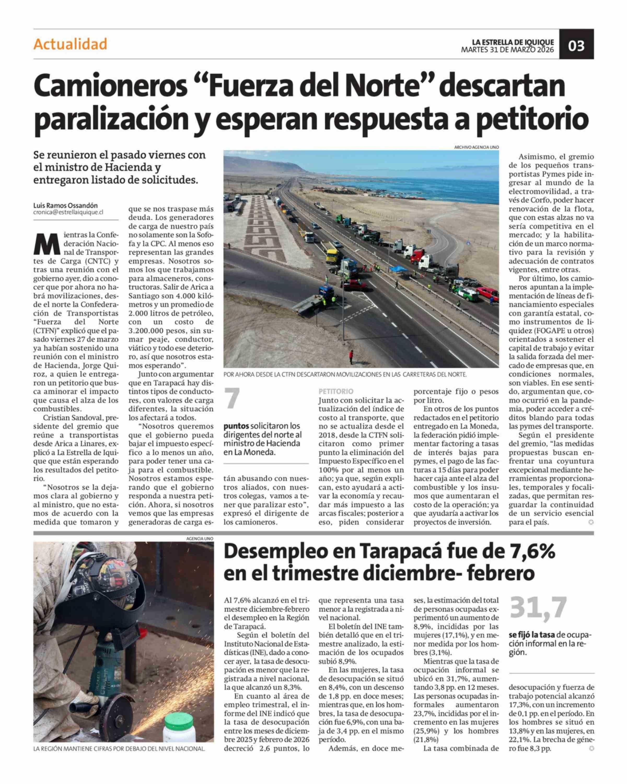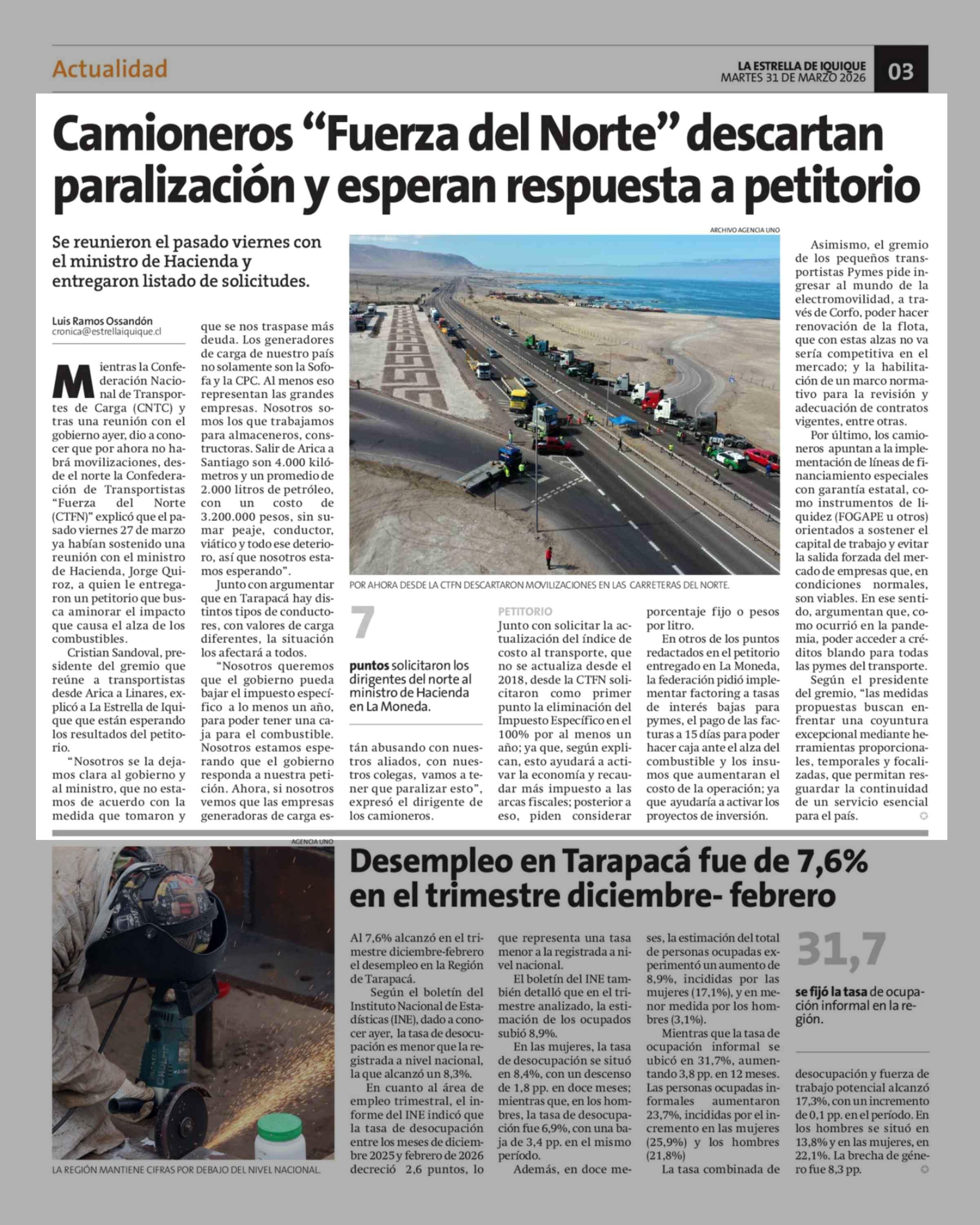Camioneros "Fuerza del Norte" descartan paralización y esperan respuesta a petitorio 31-03-2026 La Estrella de Iquique |