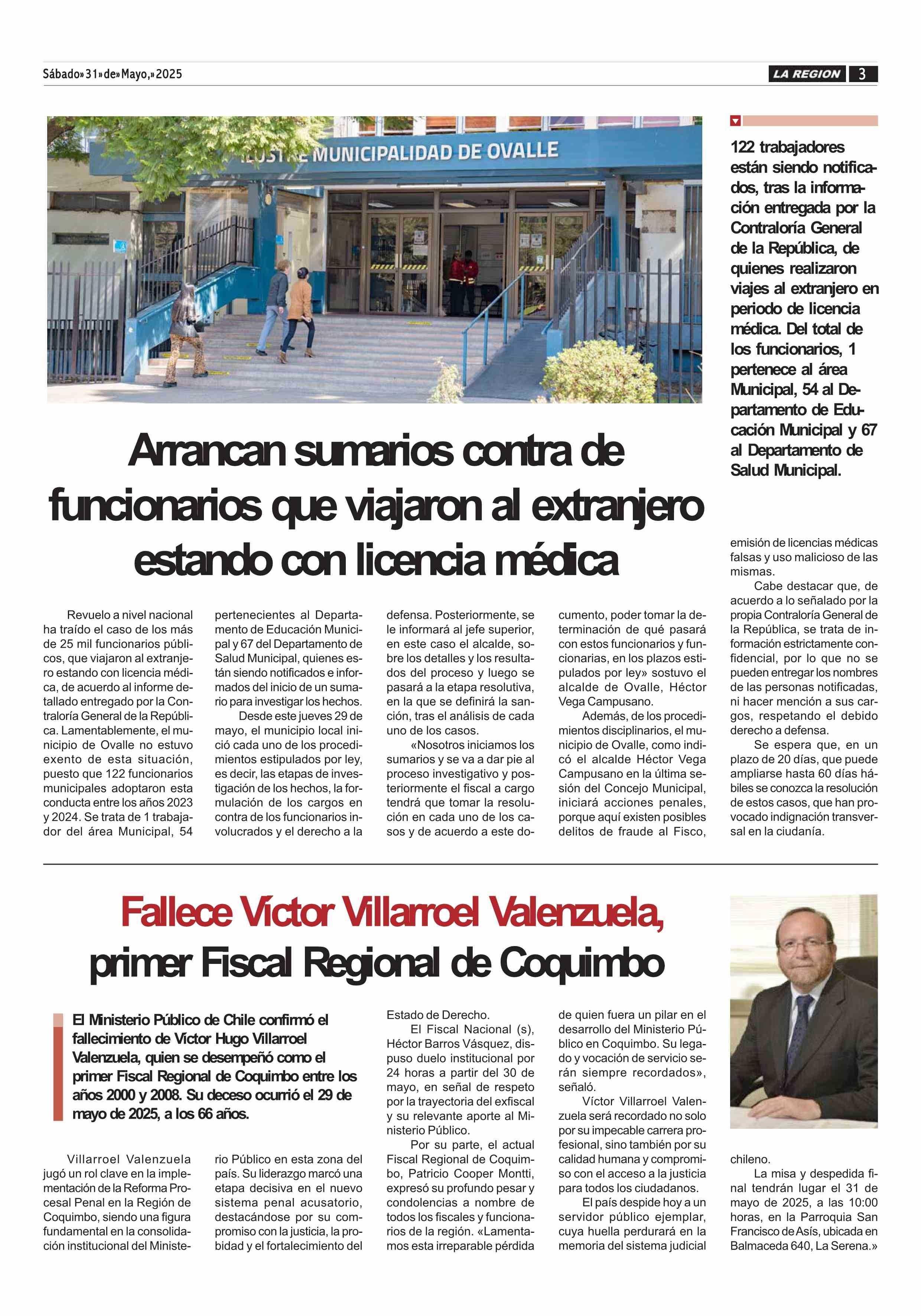 Arrancan sumarios contra de funcionarios que viajaron al extranjero estando con licencia médica 31-05-2025 Diario la Región |